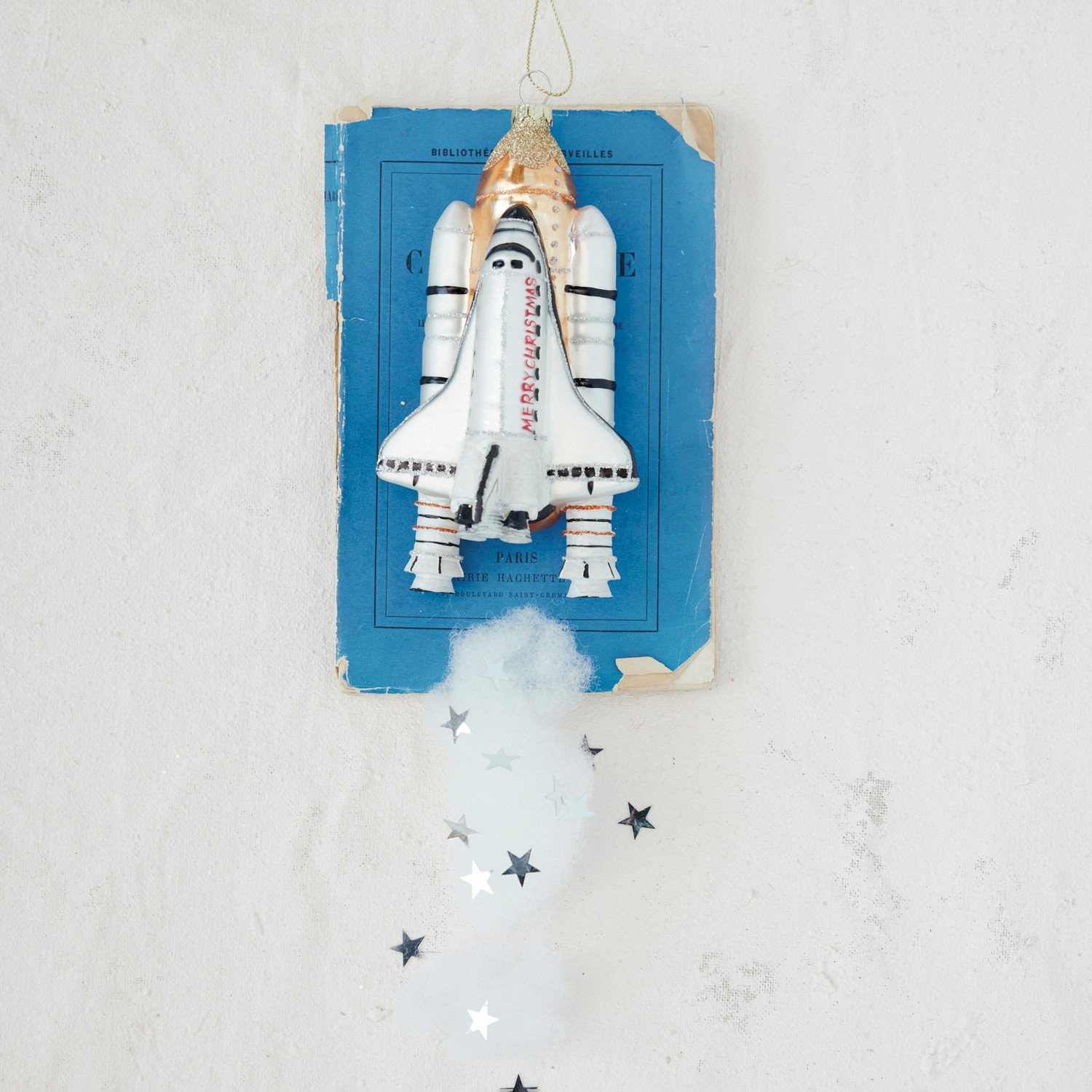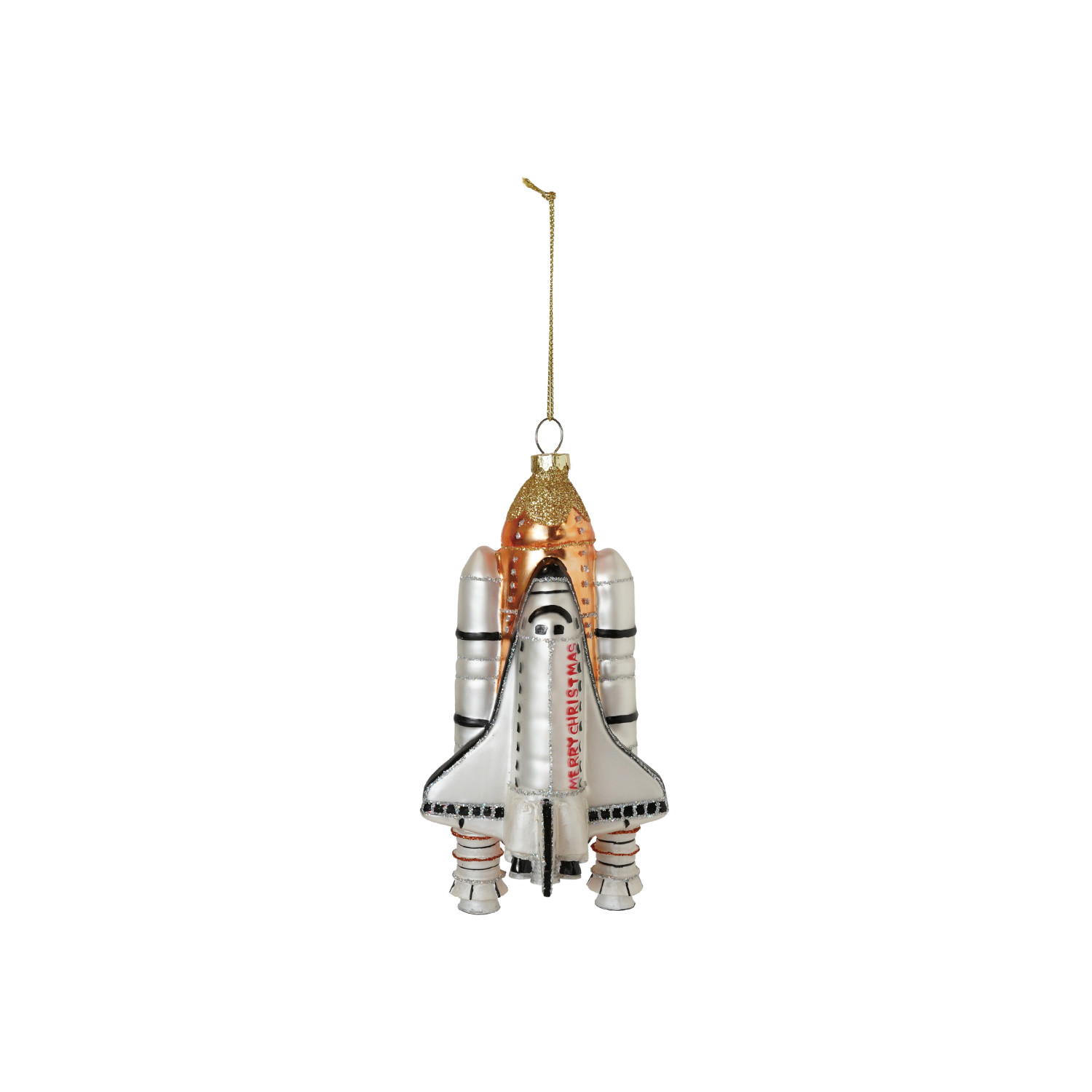 Catalog Name: 6"H Hand-Painted Glass Spaceship w/ Rocket Ornament w/ Glitter "Merry Christmas", Multi Color
