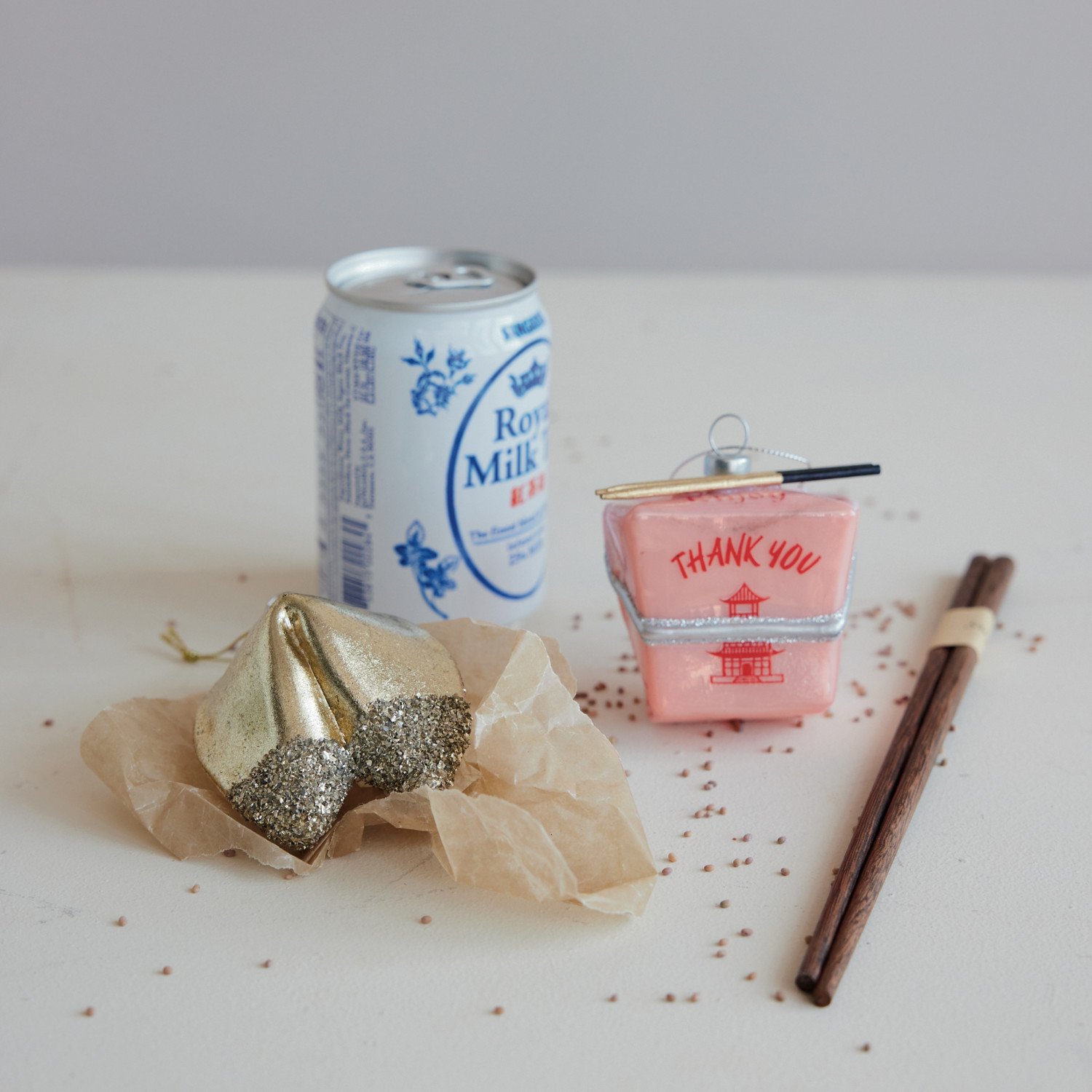 Catalog Name: 3"H Hand-Painted Glass Fortune Cookie Ornament w/ Glitter, Gold Finish