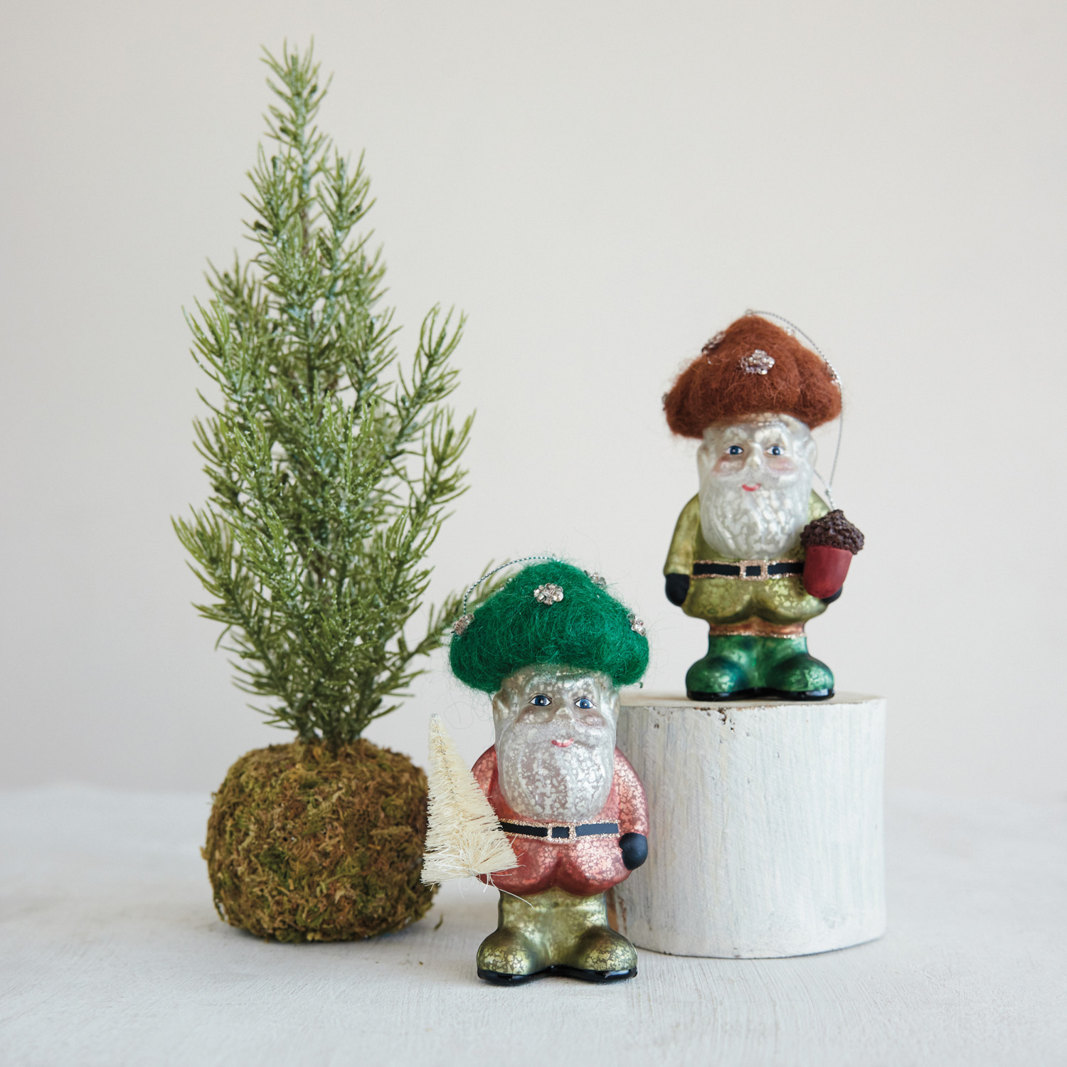 Catalog Name: 4-3/4"H Hand-Painted Mercury Glass Gnome Ornament w/ Wool Felt Mushroom Hat, Acorn/Tree & Glitter, Multi Color, 2 Styles