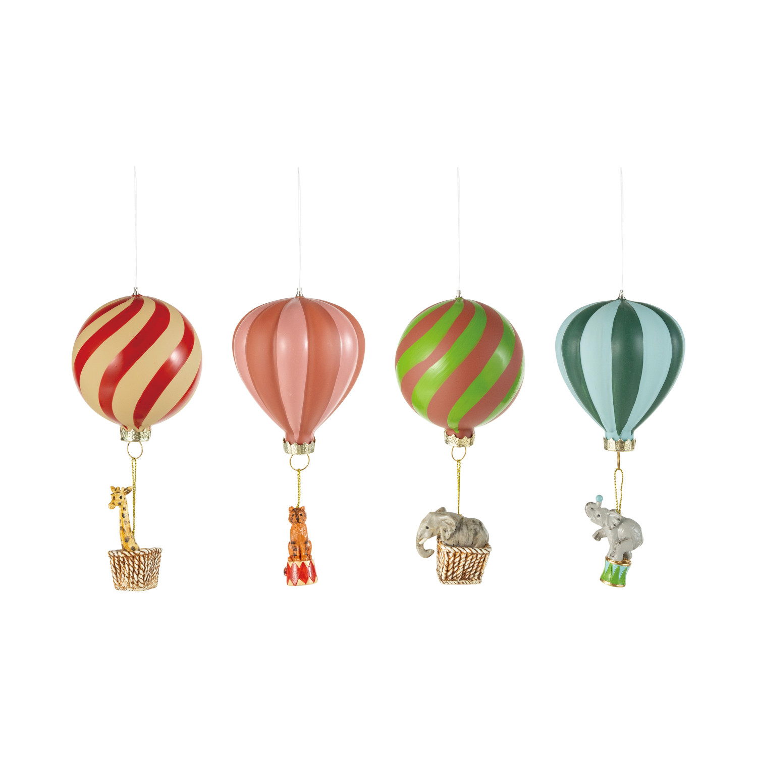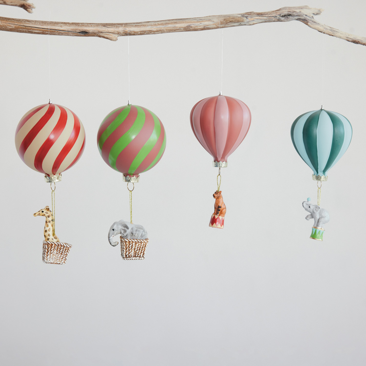 Catalog Name: 5-1/2"H Hand-Painted Glass Striped Hot Air Balloon Ornament w/ Hanging Resin Animal, Multi Color, 4 Styles