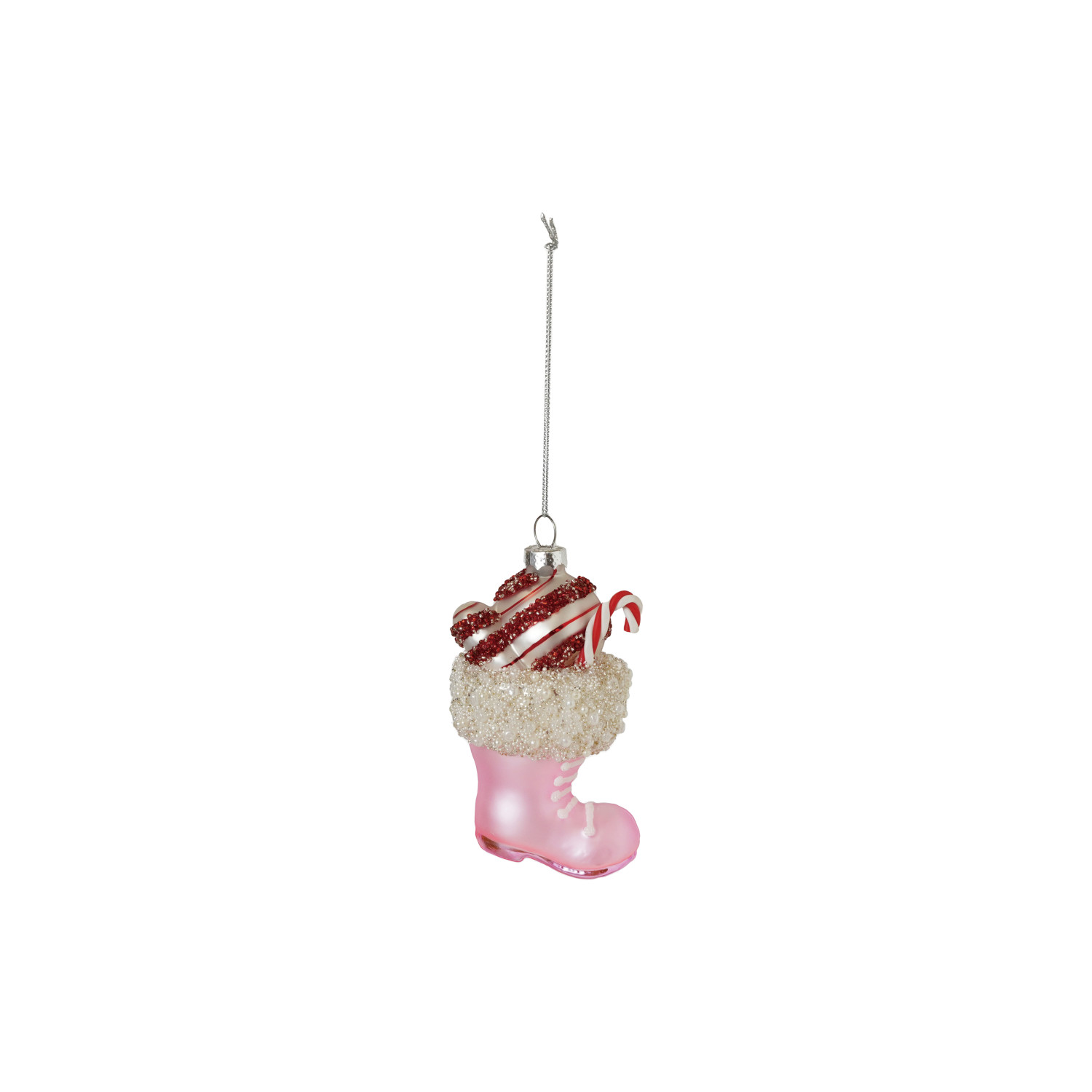 Catalog Name: 4-1/2"H Hand-Painted Glass Santa Boot Ornament w/ Candy & Beads, Pink, White & Red