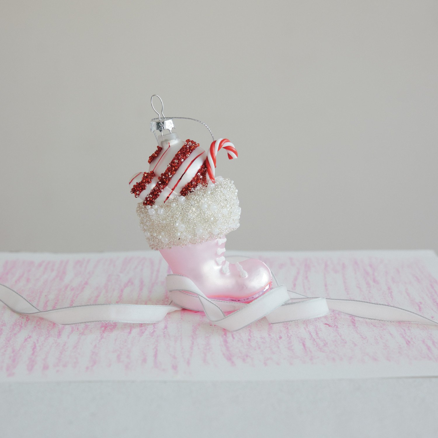 Hand-Painted Glass Santa Boot Ornament with Candy & Beads, Pink, White & Red