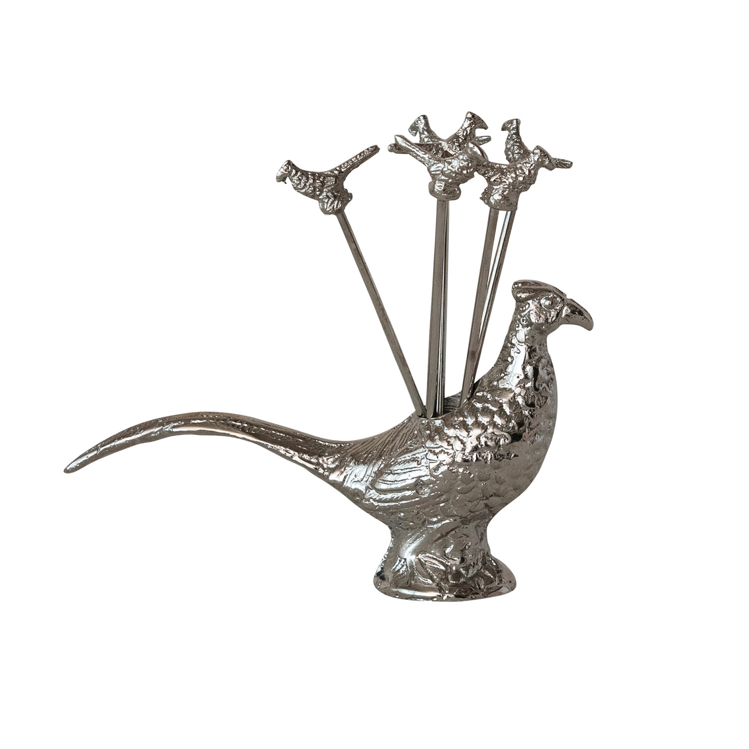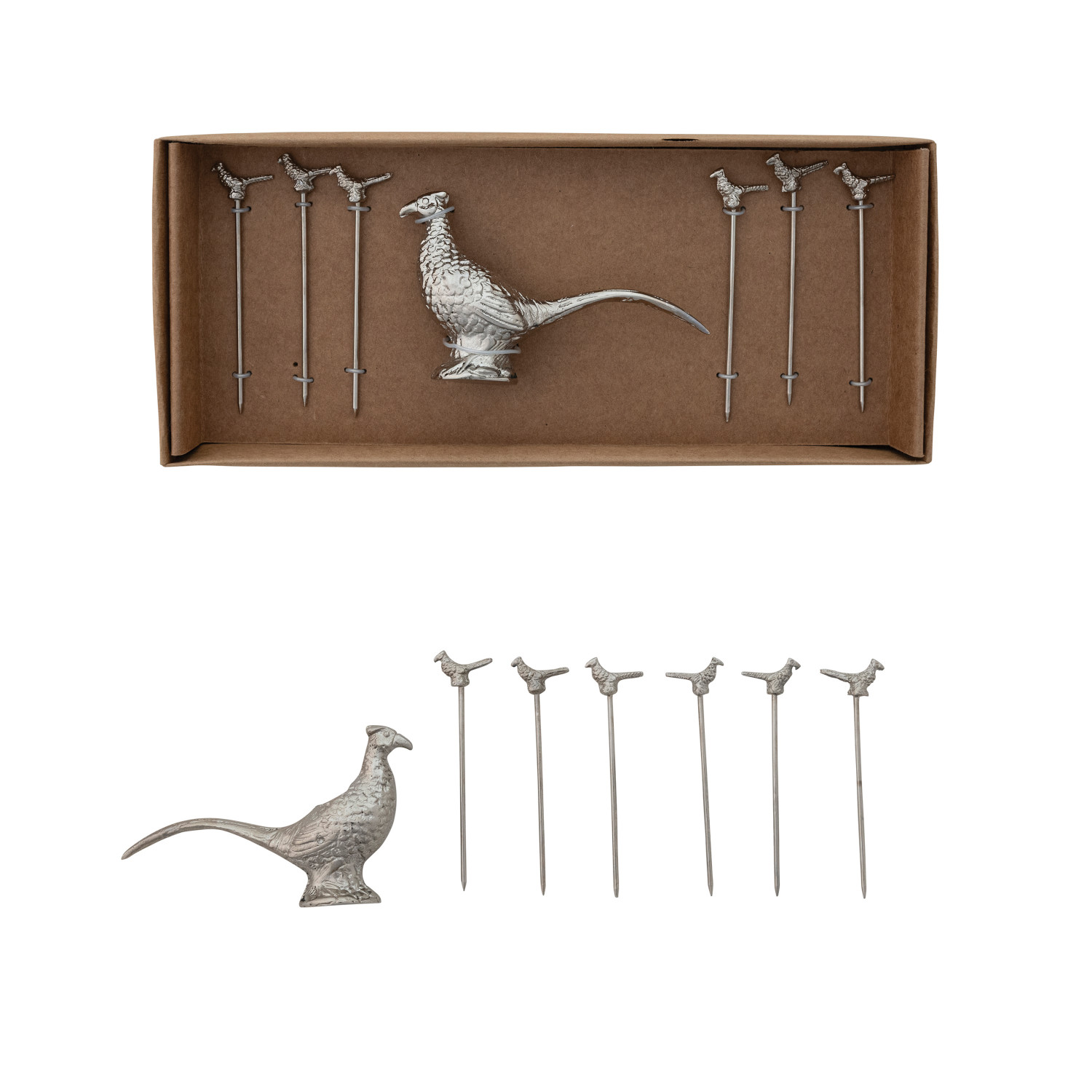 Catalog Name: 4-1/4"L x 2-1/2"H Cast Aluminum Pheasant Shaped Holder w/ (6) 3-1/2"L Stainless Steel Appetizer Picks w/ Pheasant Handles, Set of 7 in Kraft Box