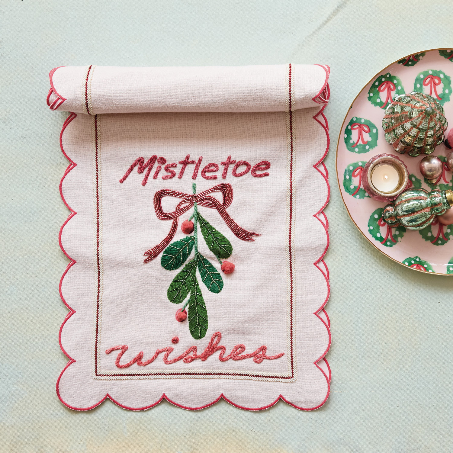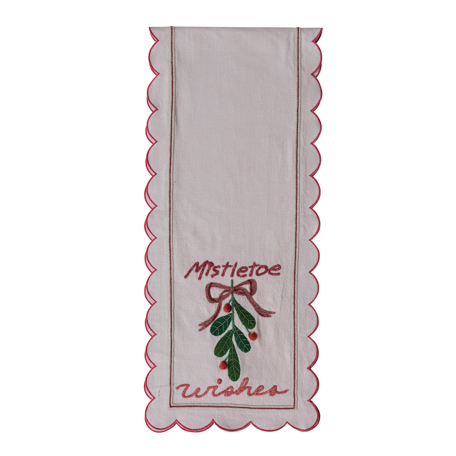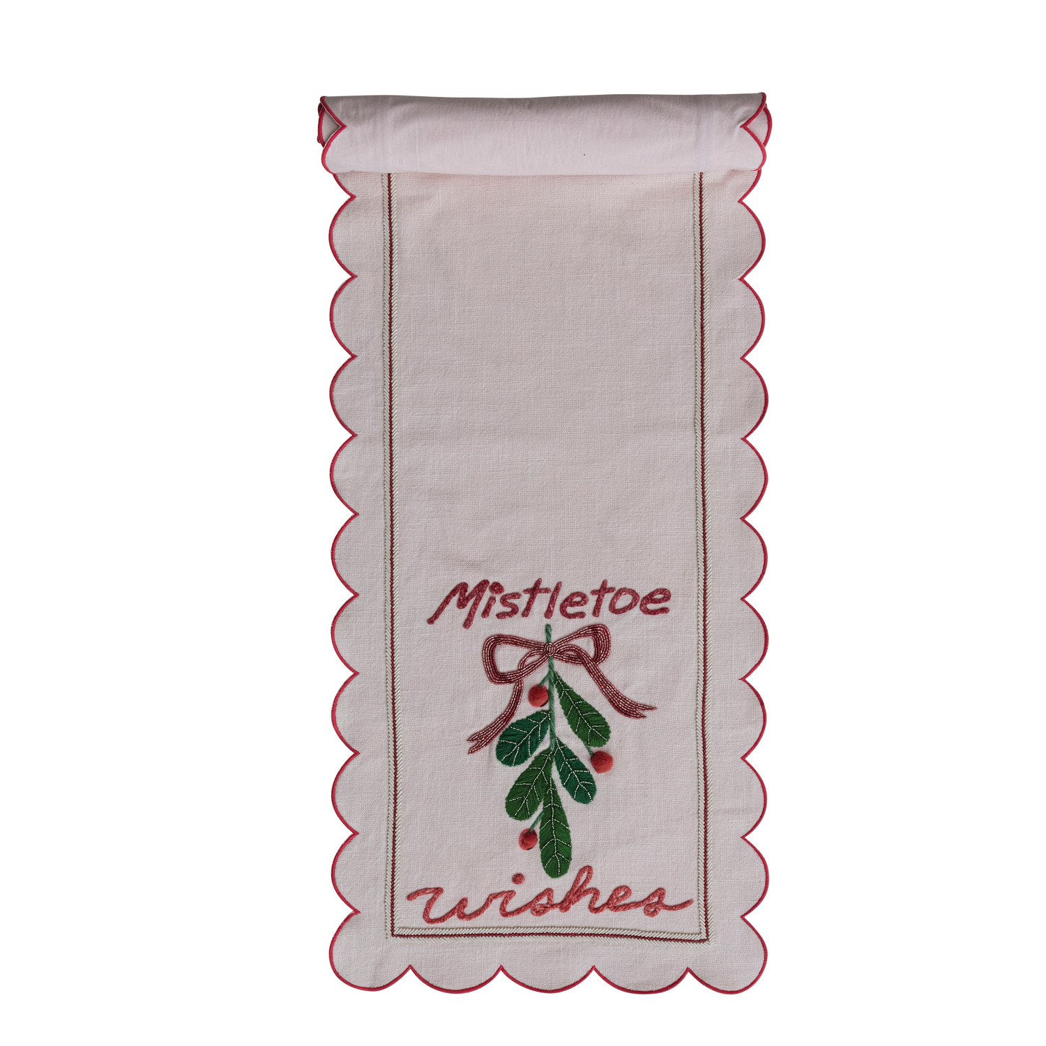 Catalog Name: 72"L x 14"W Cotton Printed Scalloped Table Runner w/ Mistletoe, Bows, Embroidery, Beads & Pom Poms "Mistletoe Wishes", Pink, Red & Green ©