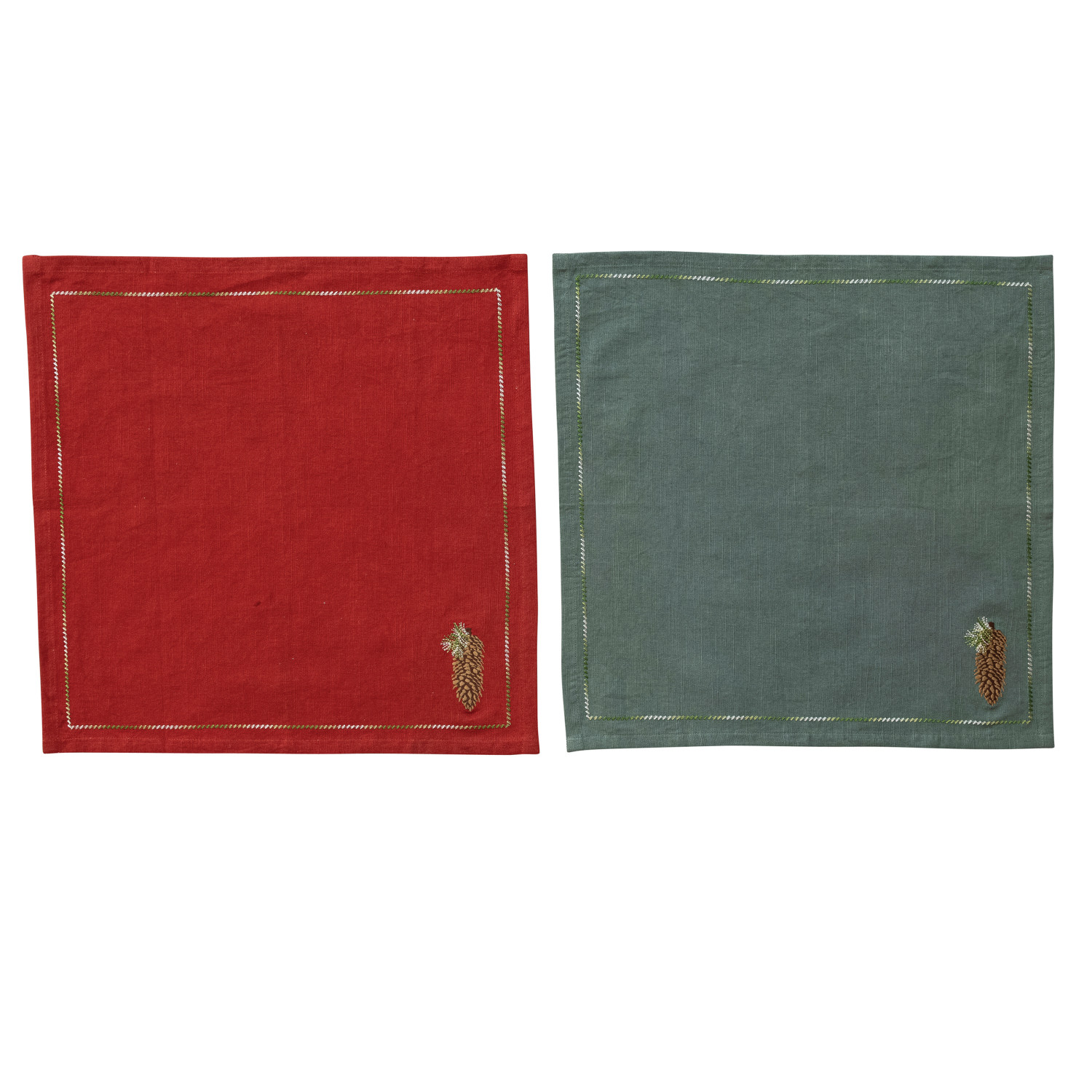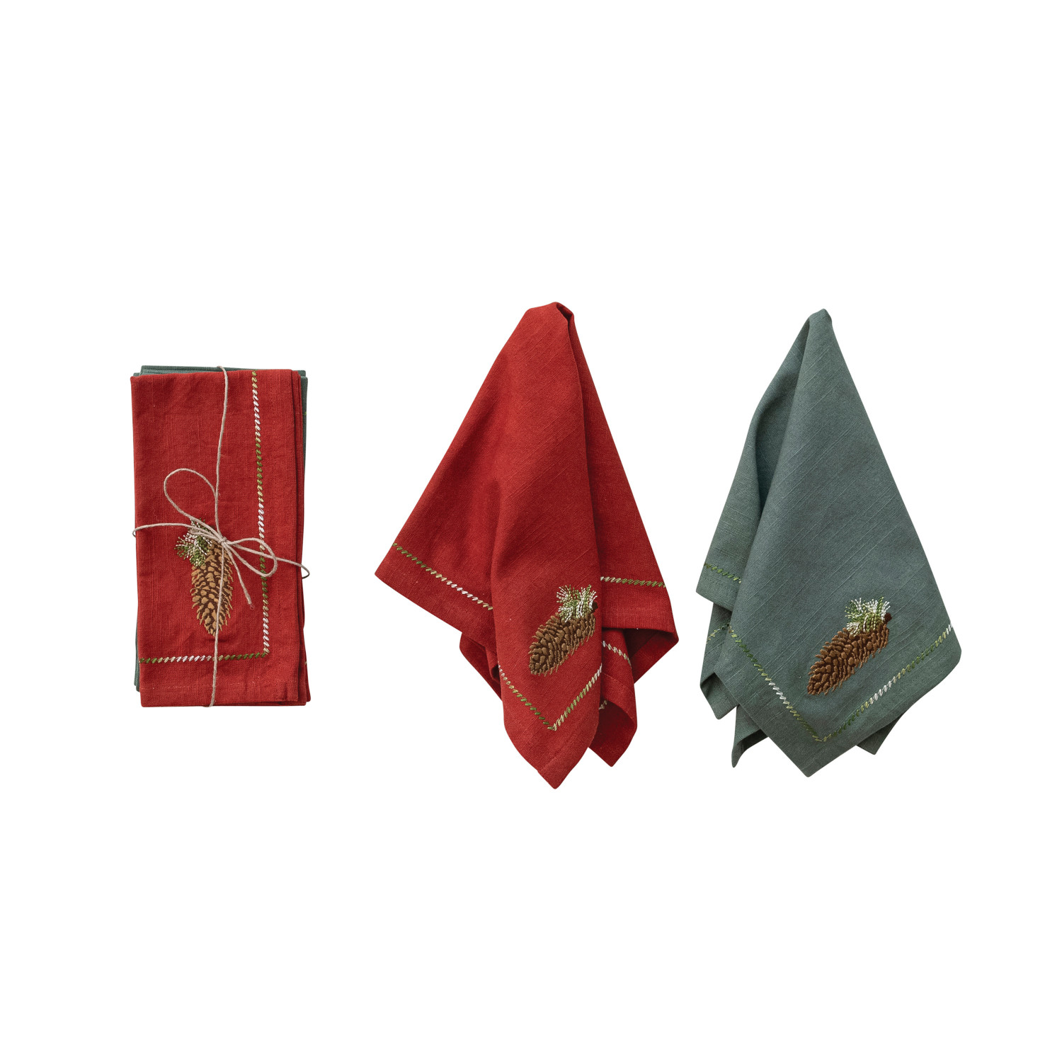 Catalog Name: 18" Square Cotton Napkins w/ Embroidered Pinecone, Multi Color, Set of 4 Tied w/ Jute