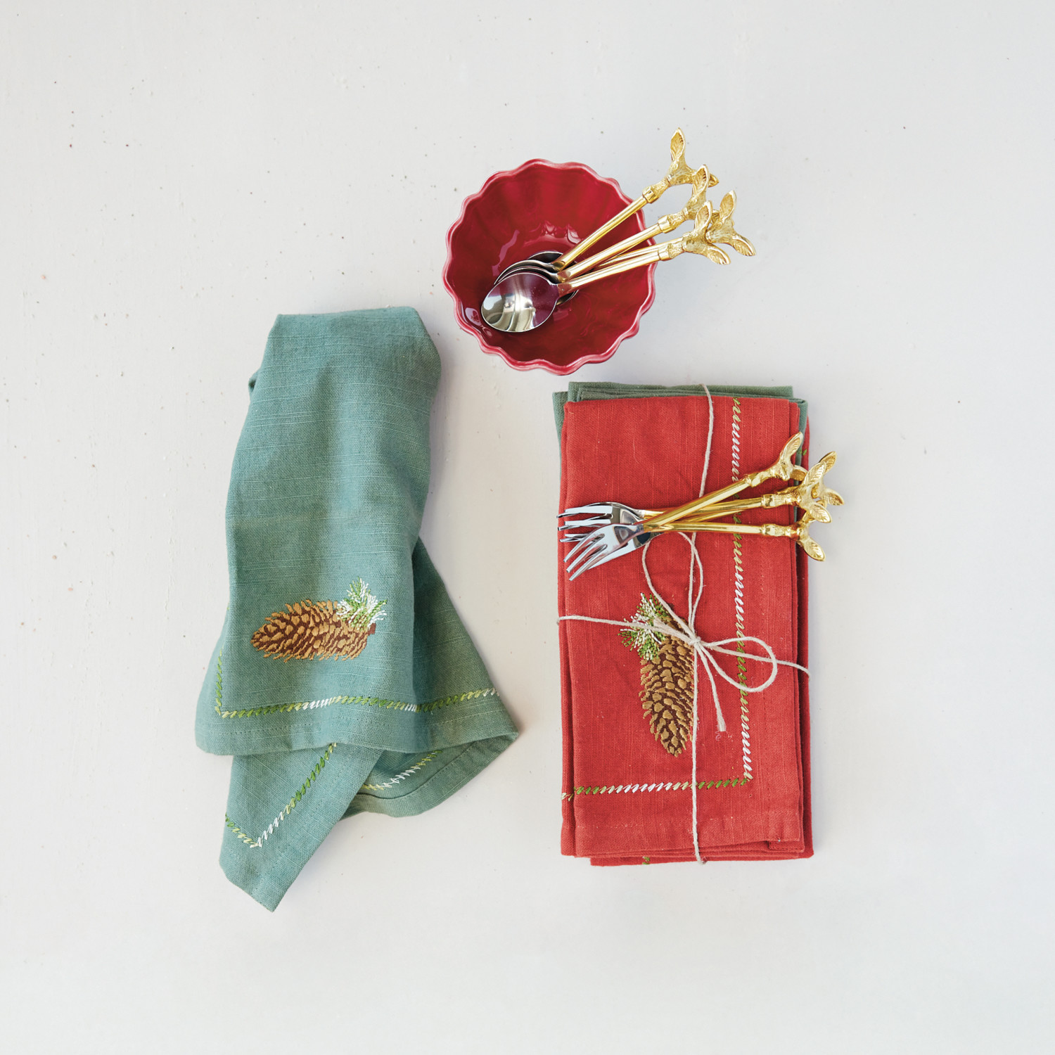 Cotton Napkins with Embroidered Pinecone, Set of 4 Tied with Jute