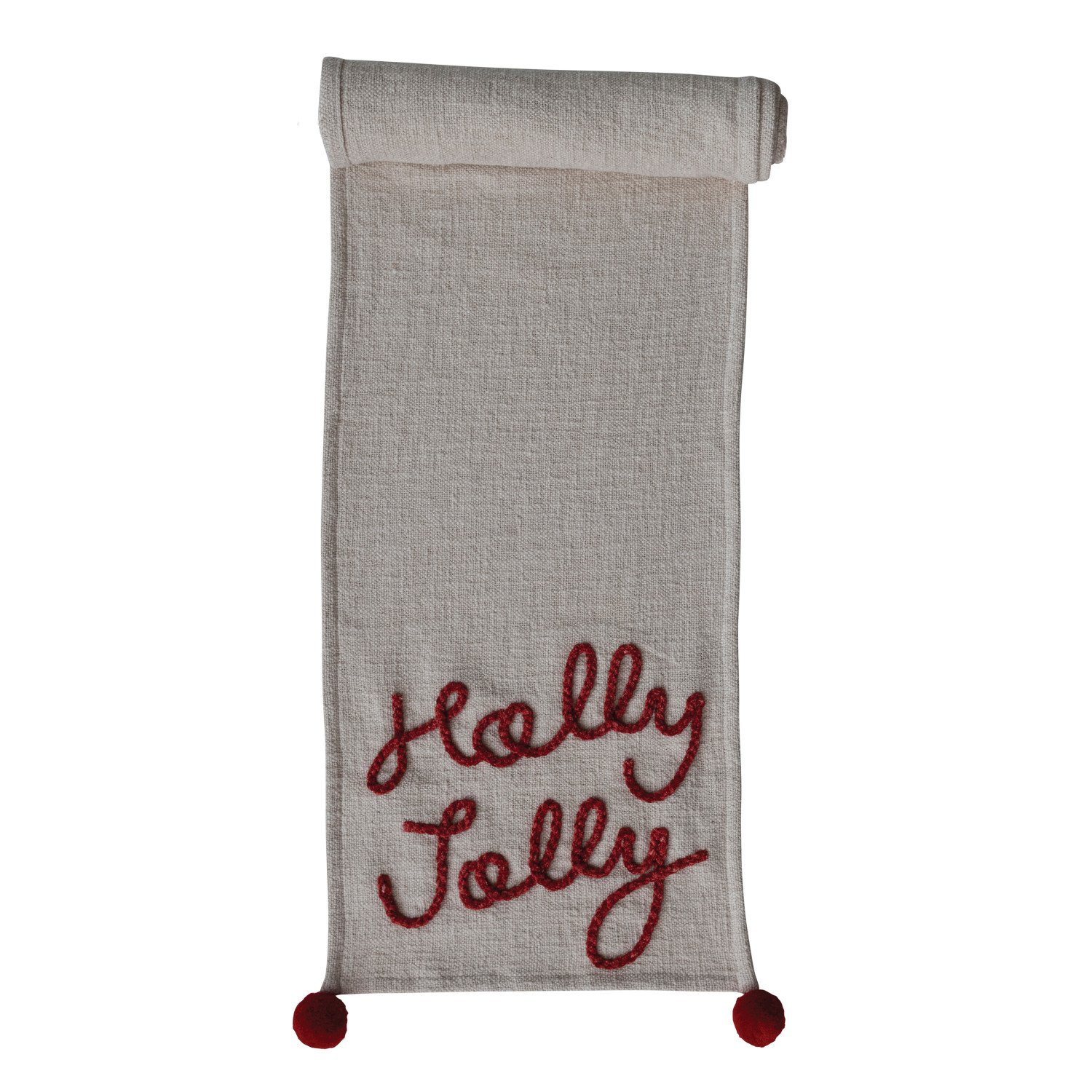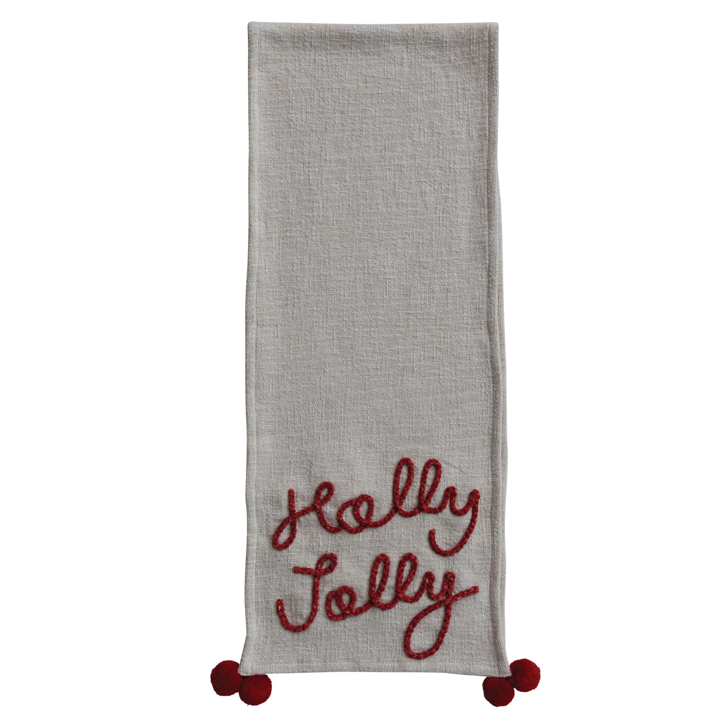 Cotton Slub Table Runner with Pom Poms & Embroidered "Holly Jolly"