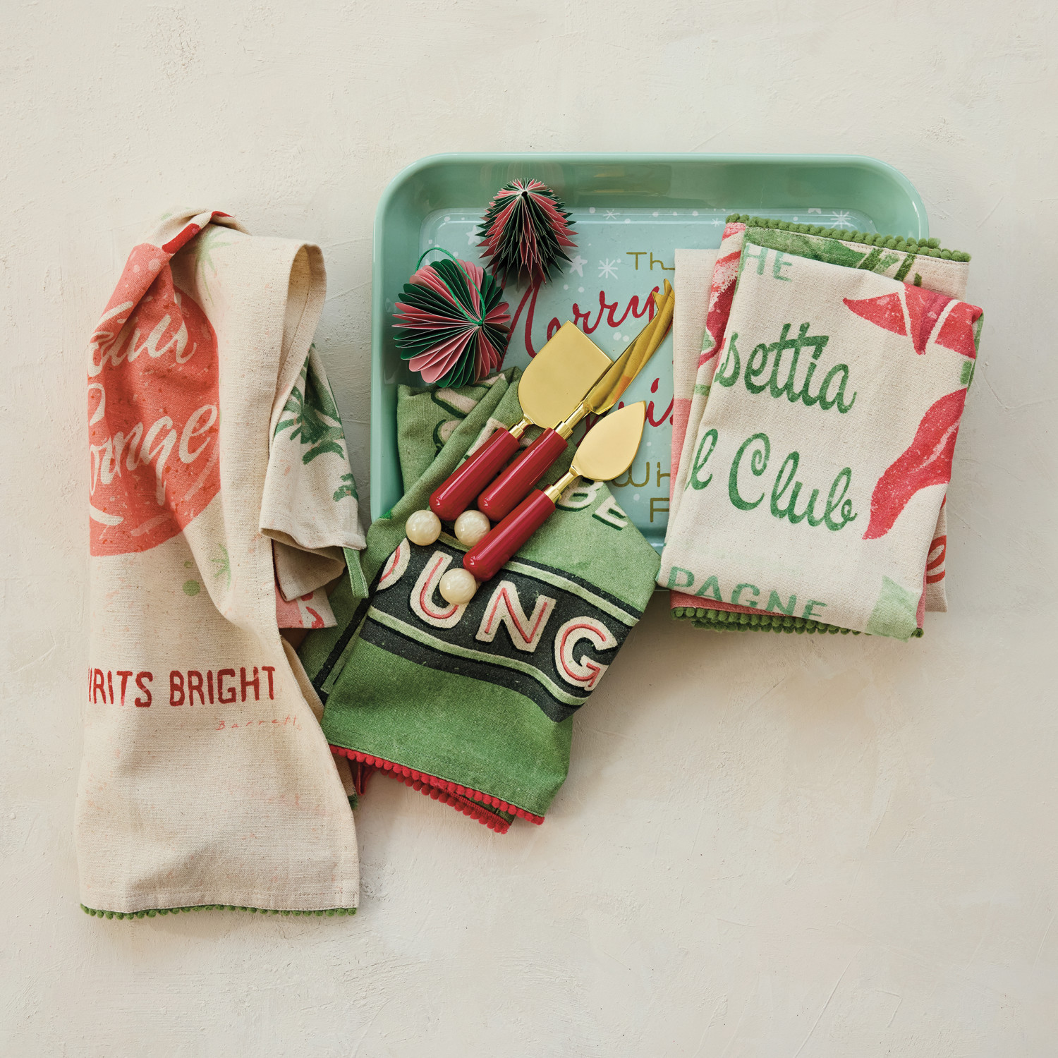 Cotton & Linen Printed Tea Towel with Holiday Bar Saying, Image & Pom Pom Trim, 4 Styles ©