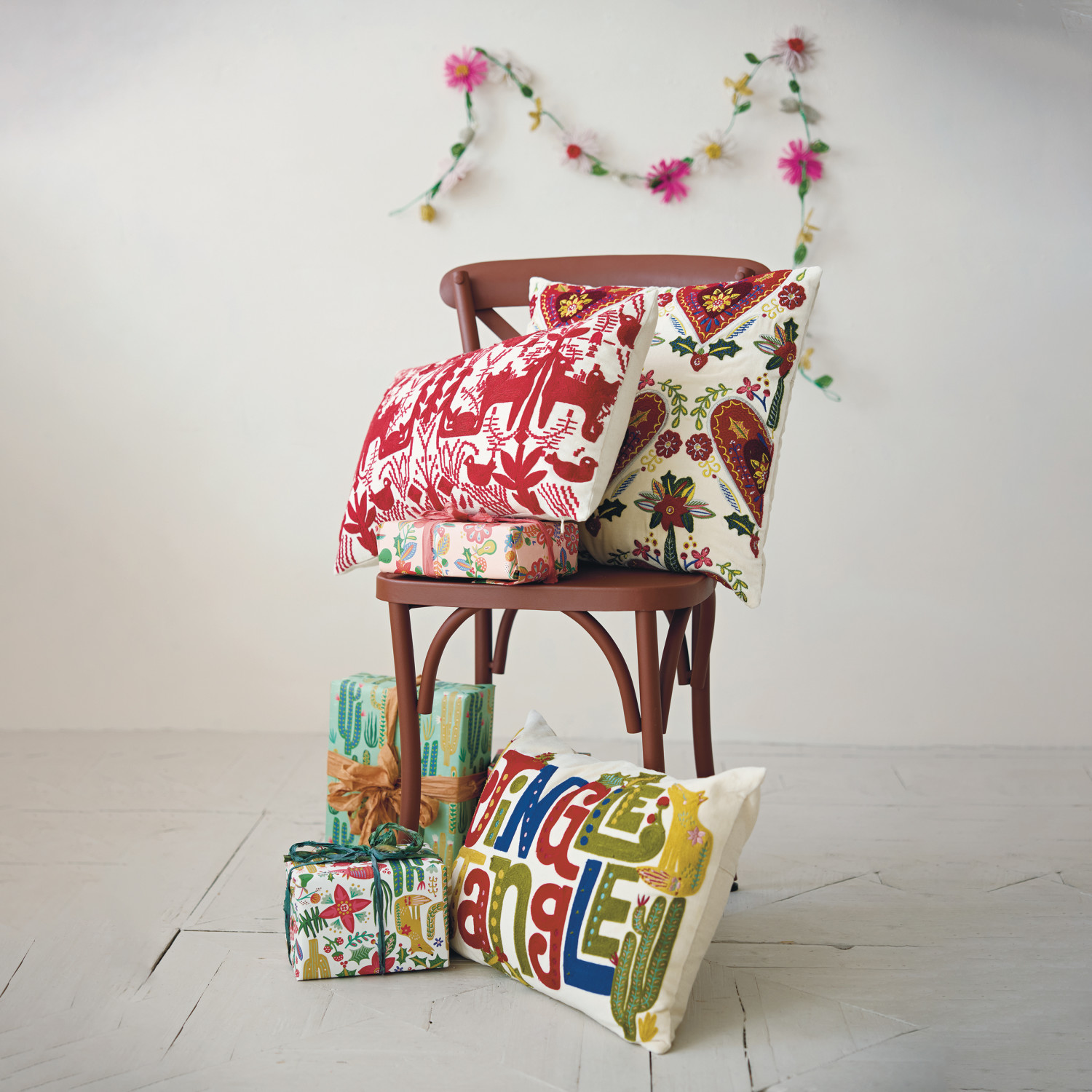 Catalog Name: 20"L x 14"H Cotton Velvet Printed Lumbar Pillow w/ Cacti, Coyote, Seasonal Botanicals & Embroidery "Jingle Jangle", Multi Color ©