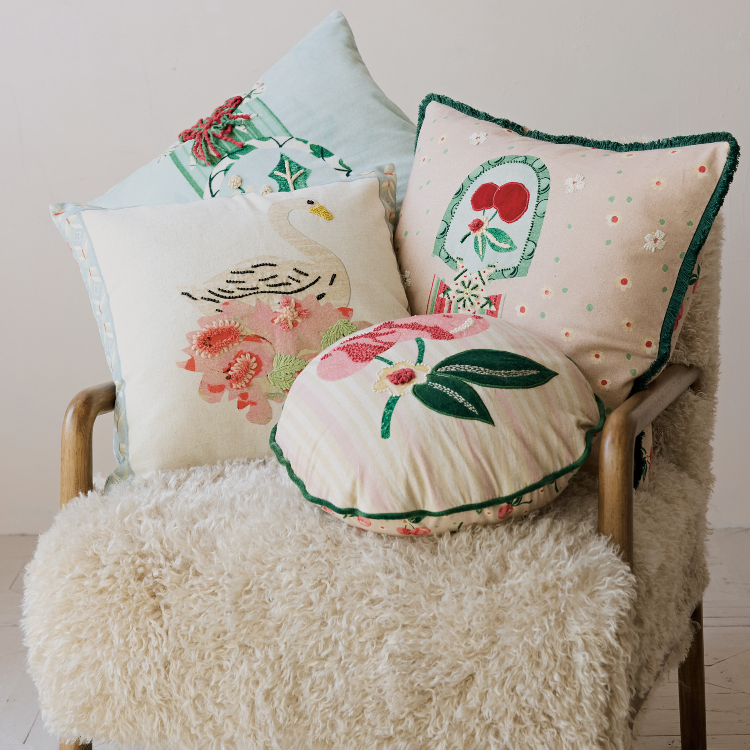 Catalog Name: 20" Square Cotton & Linen Printed Pillow w/ Medal, Embroidery, Applique, Tufted Fringe & Cherries Patterned Back, Multi Color ©