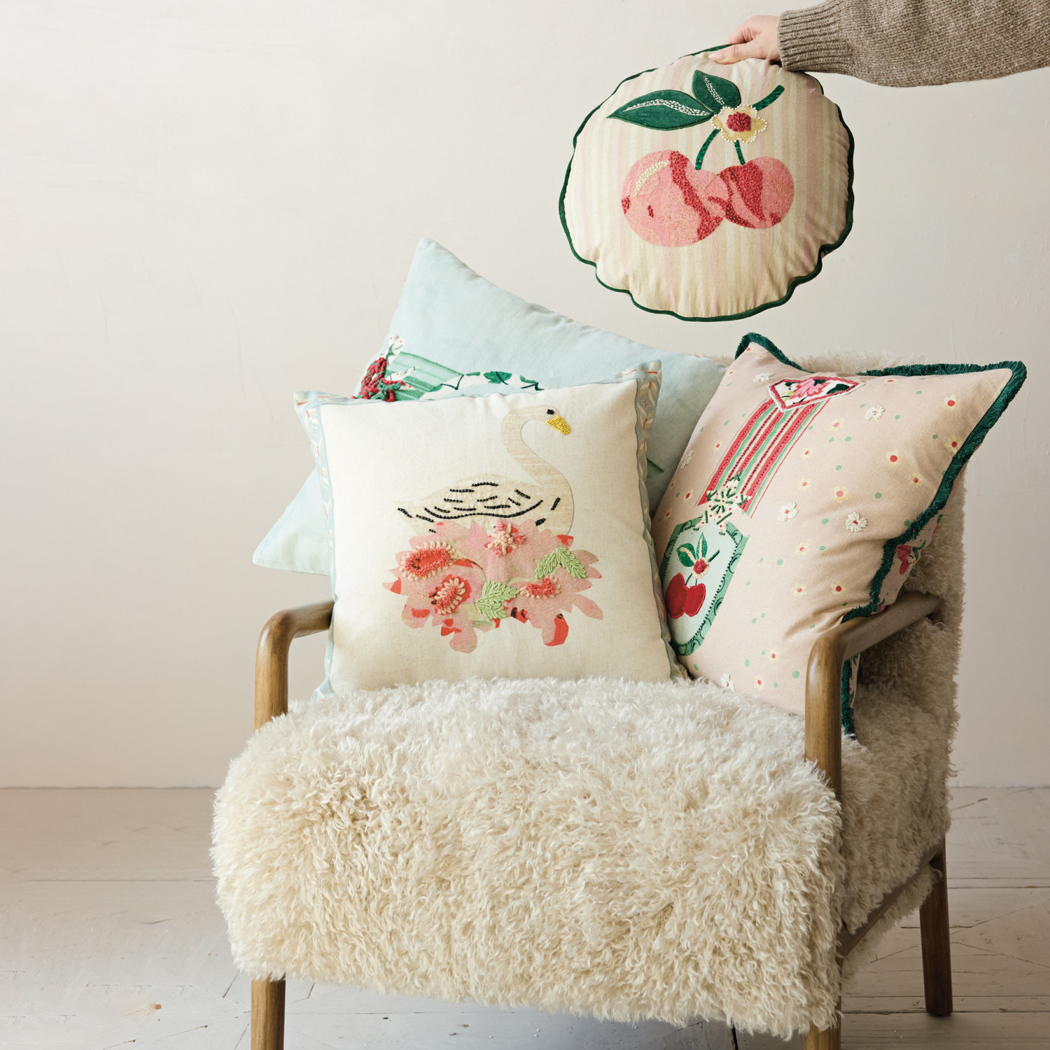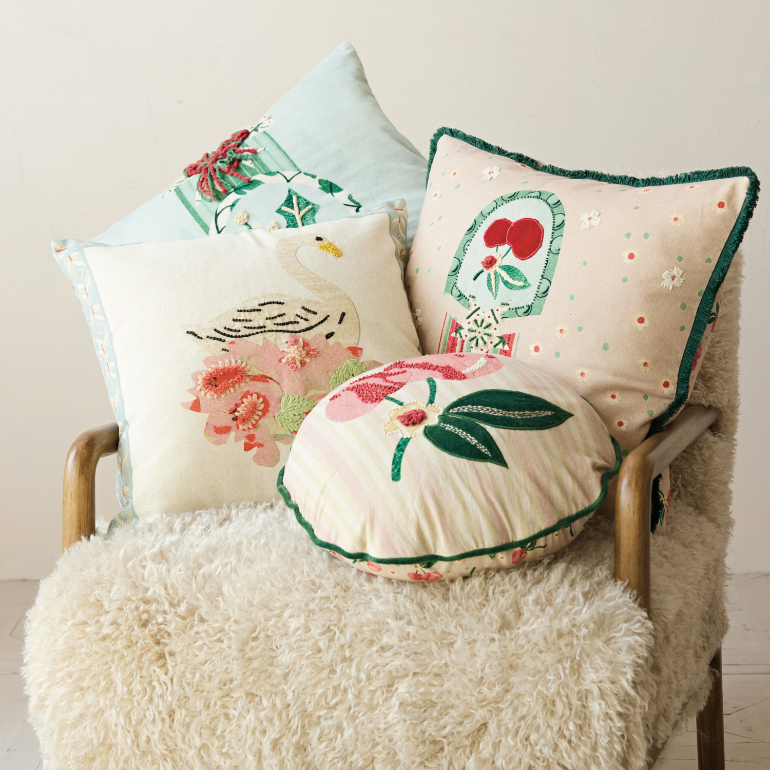20" Square Cotton Velvet Printed Pillow with Bow, Flowers, Holly Emblem & Embroidery ©
