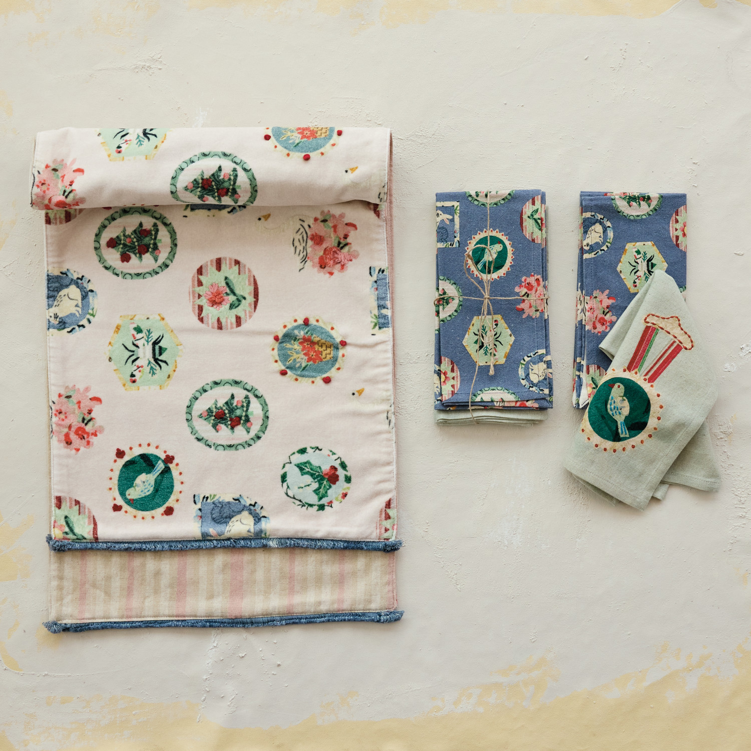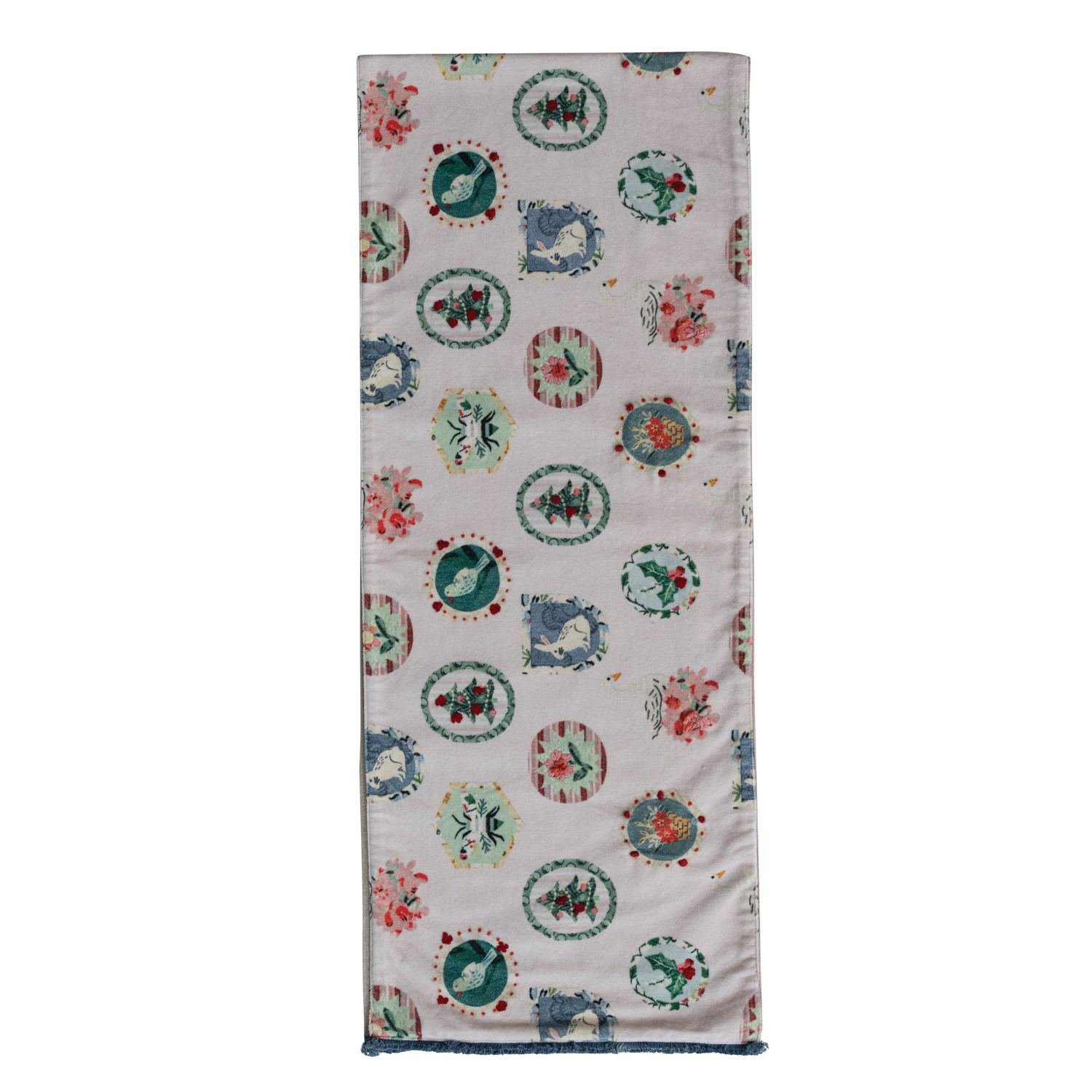 Cotton Velvet Printed Two-Sided Table Runner with Tufted Fringe & Linen Back ©