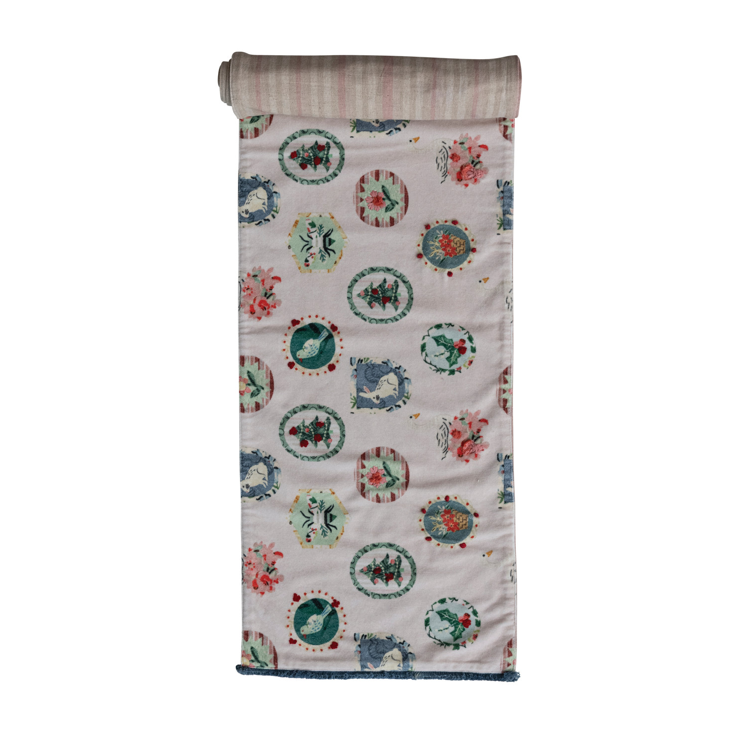 Catalog Name: 72"L x 14"W Cotton Velvet Printed Two-Sided Table Runner w/ Pattern, Tufted Fringe & Striped Cotton & Linen Back, Multi Color ©