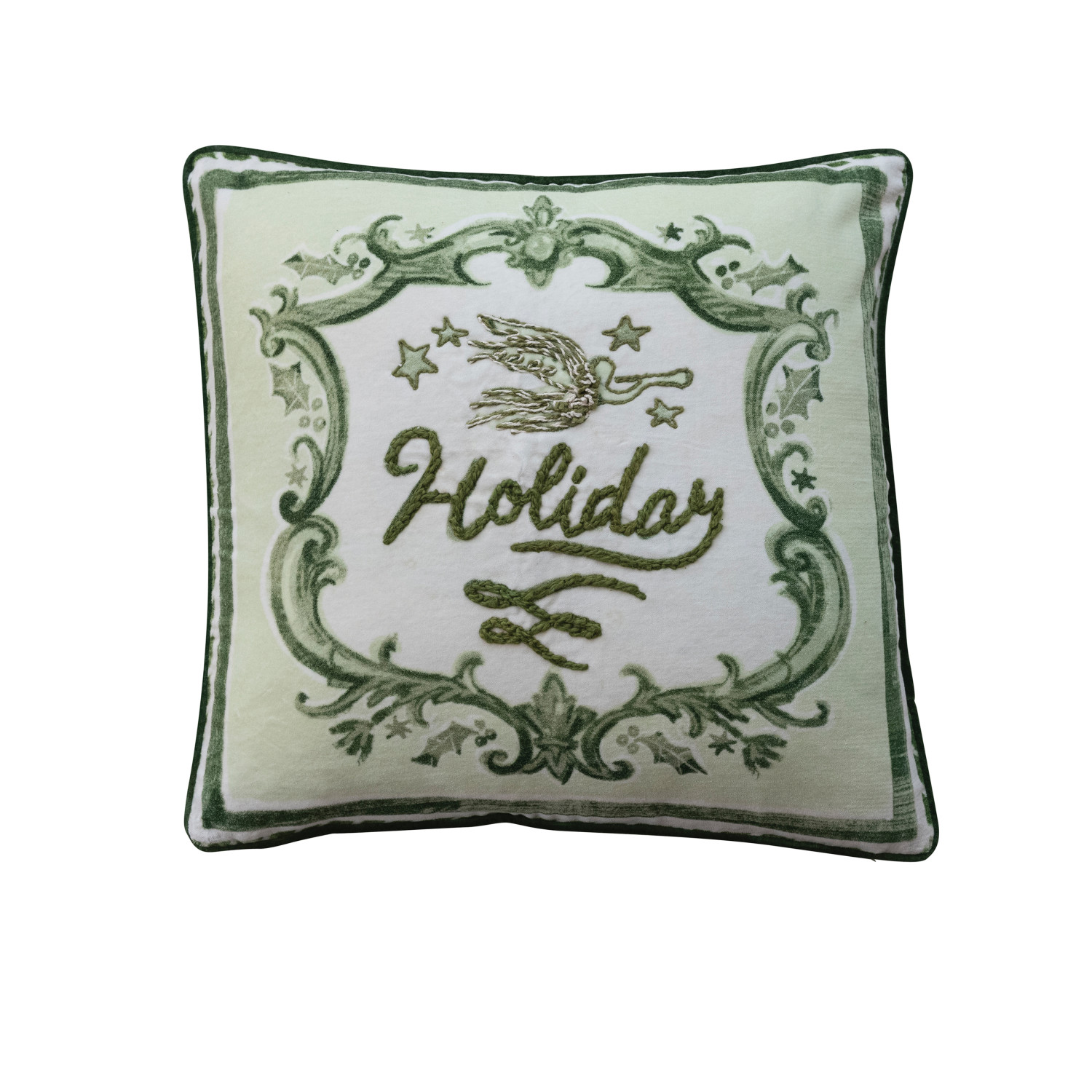 Catalog Name: 20" Square Cotton Printed Pillow w/ Angel, Stars, Embroidery, Piping & Cotton Velvet Striped Back "Holiday", Green & Cream Color ©