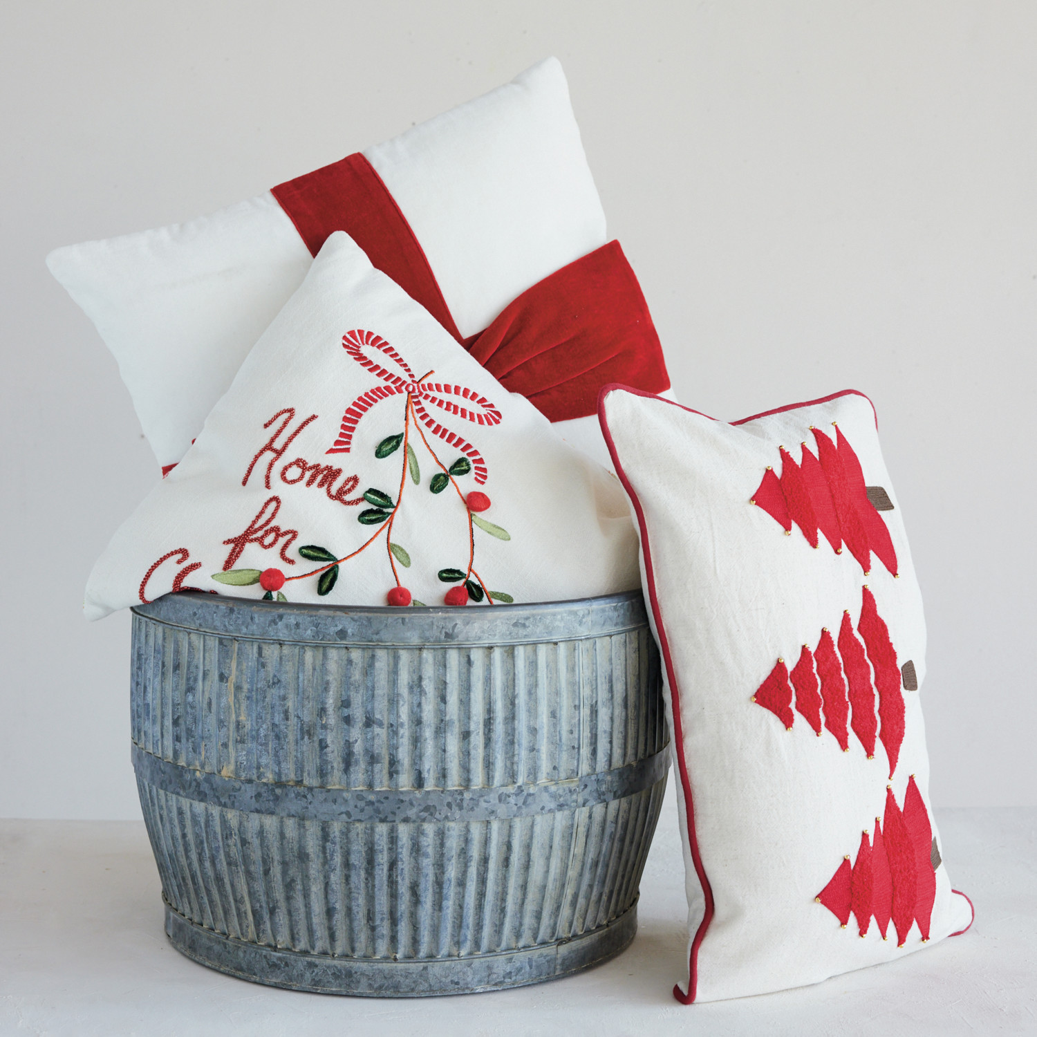 Catalog Name: 20" Square Cotton Velvet Pillow w/ Bow, White & Red