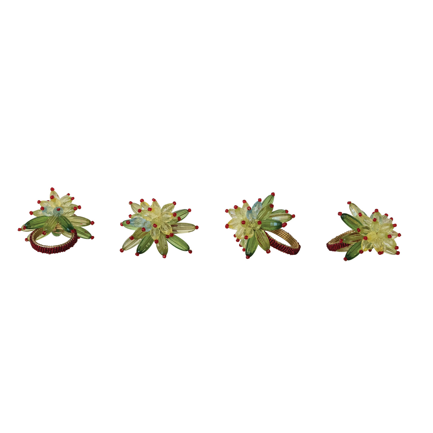 Catalog Name: 2" Round x 3"H Handmade Glass & Acrylic Beaded Metal Flower Napkin Rings, Green & Red, Set of 4 Tied w/ Gold Cord