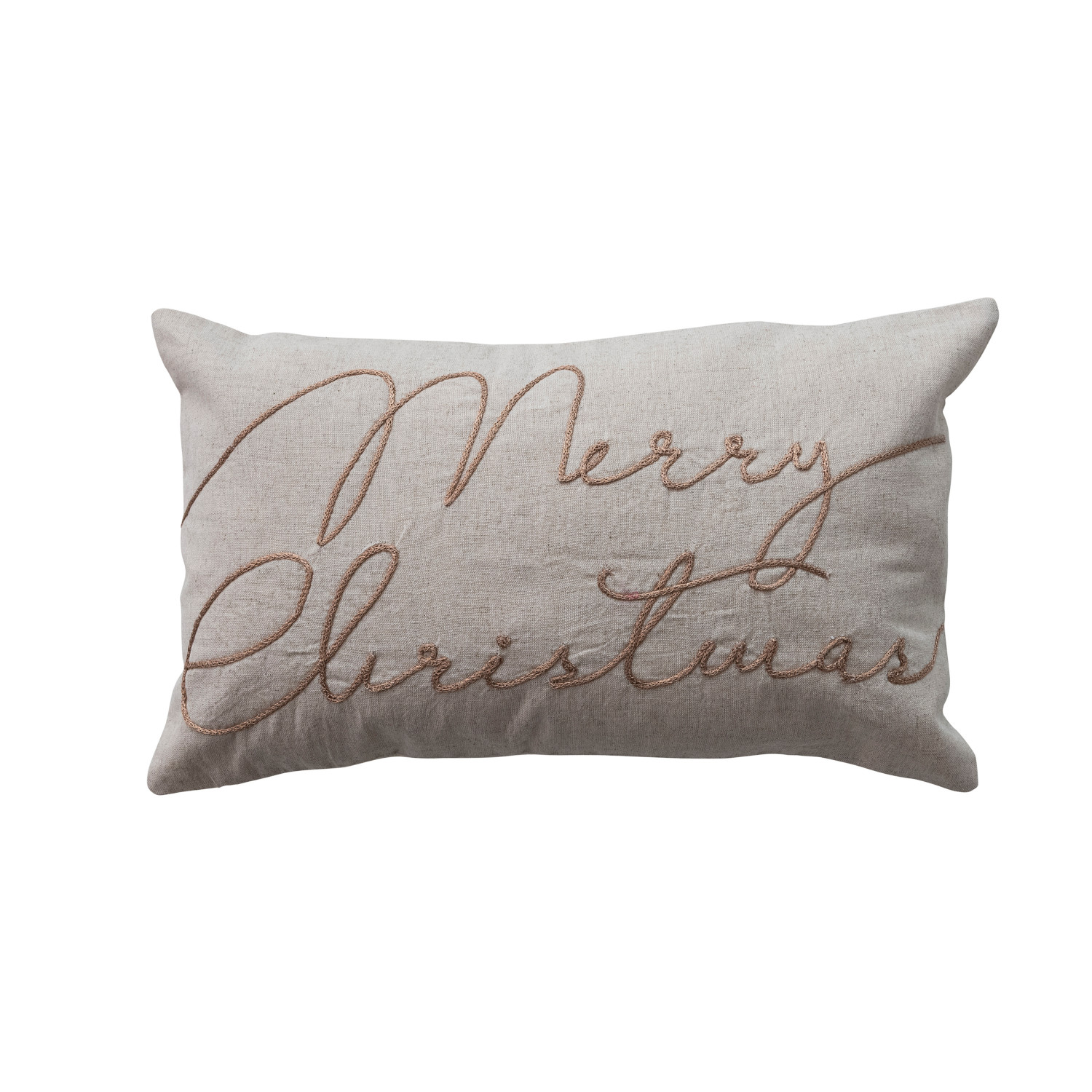 Catalog Name: 20"L x 12"H Cotton & Linen Lumbar Pillow w/ Embroidered "Merry Christmas", Natural & Copper Color
