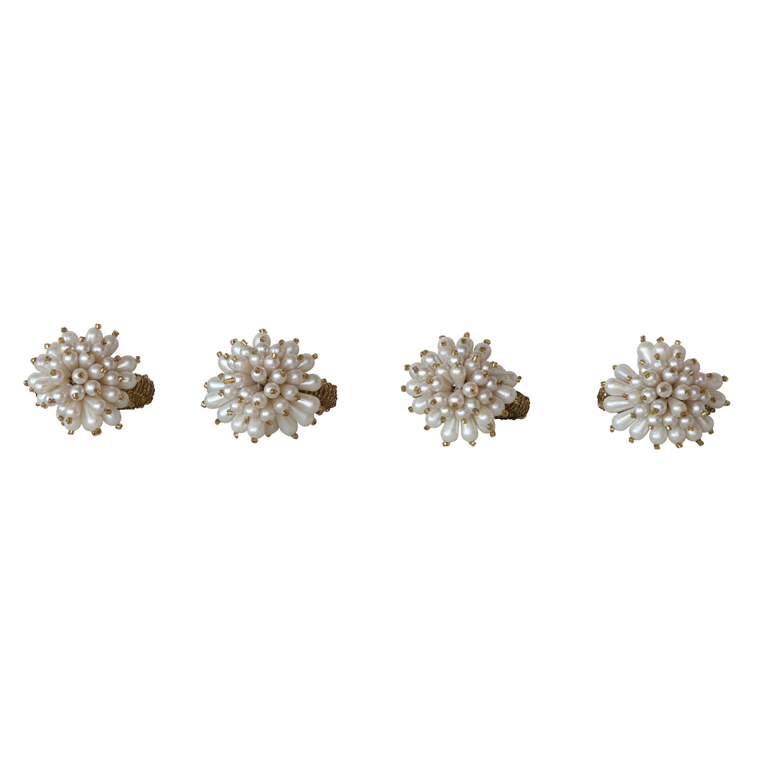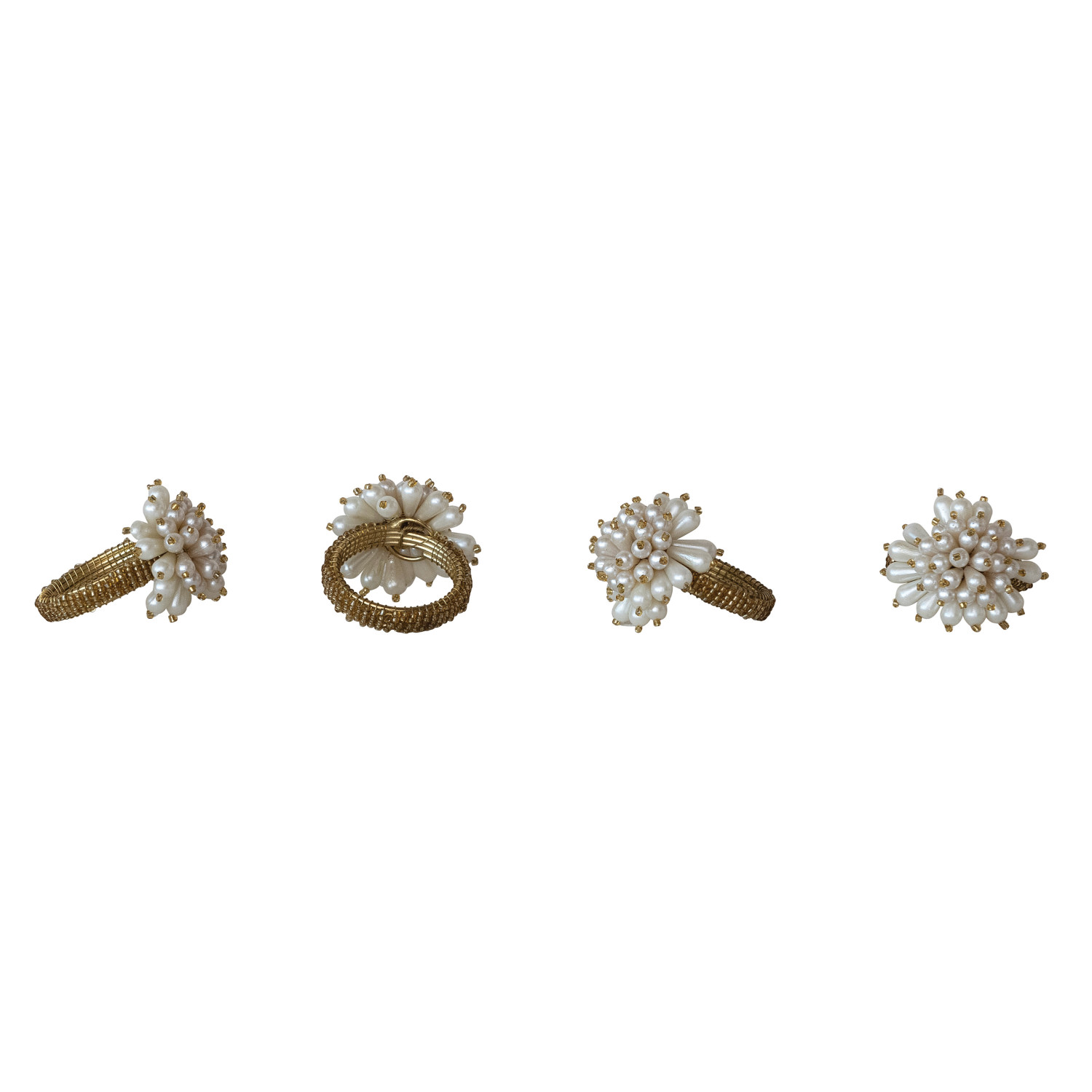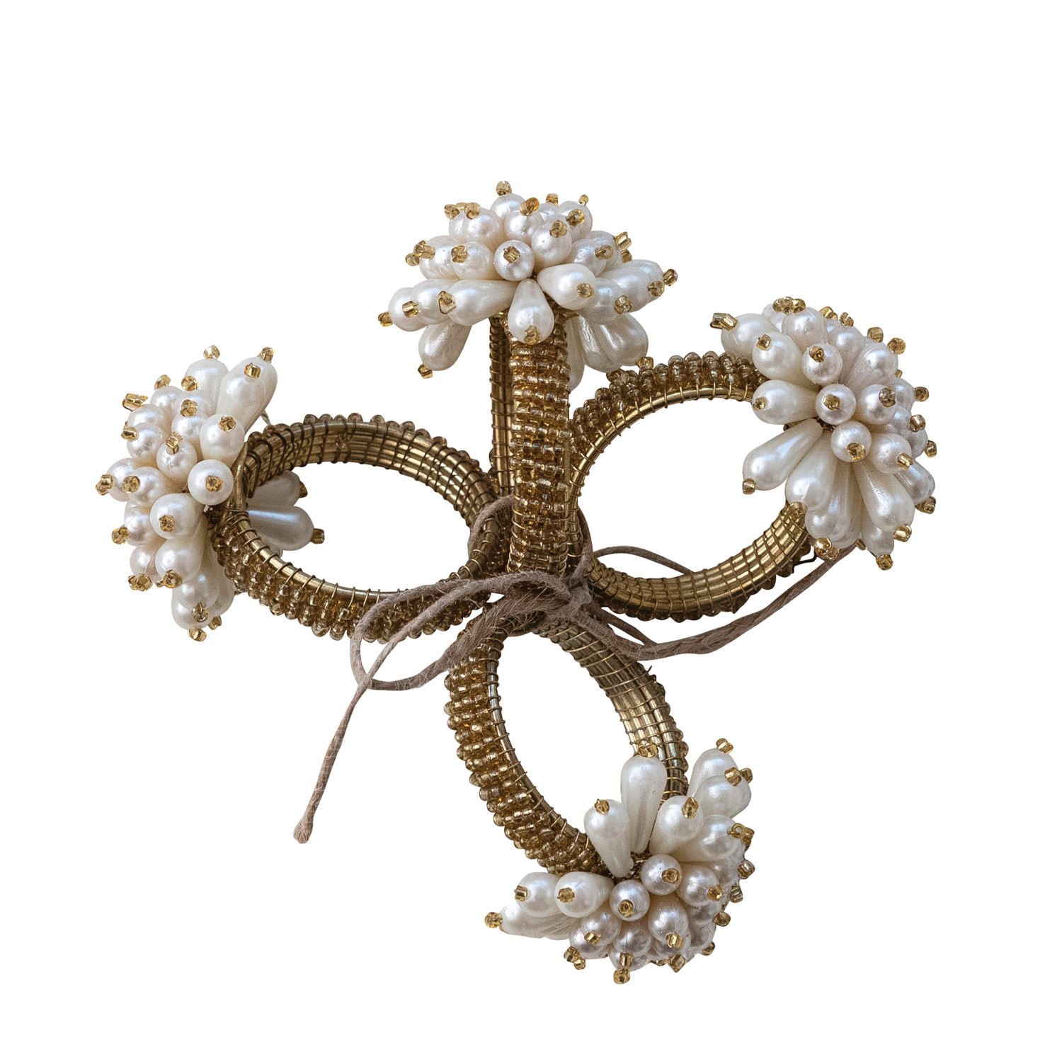 Catalog Name: 1-3/4" Round x 2-1/2"H Glass Beaded Metal Napkin Rings w/ Faux Pearl Clusters, Gold Finish, Set of 4 Tied w/ Jute