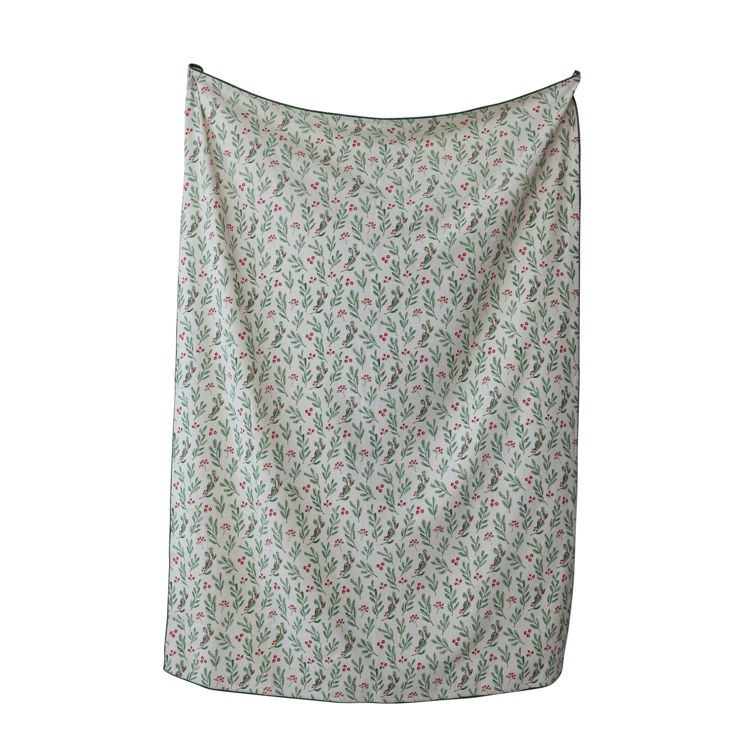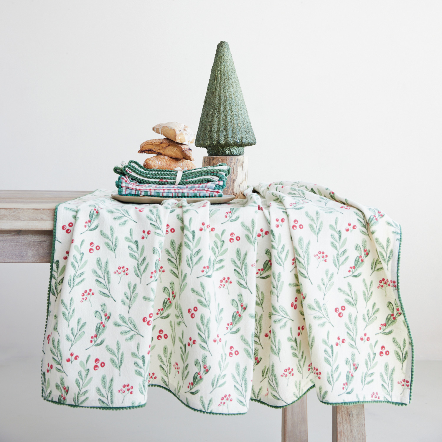 Catalog Name: 84"L x 60"W Cotton Printed Table Cloth w/ Mistletoe Pattern & Mini Pom Pom Trim, White, Green & Red