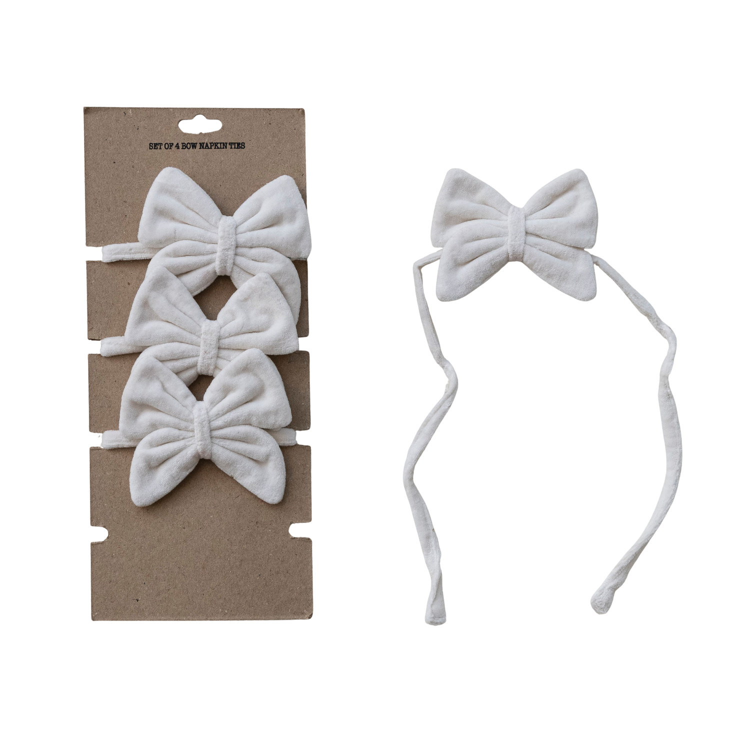 Cotton Velvet Bow Napkin Ties, White, Set of 4 on Card