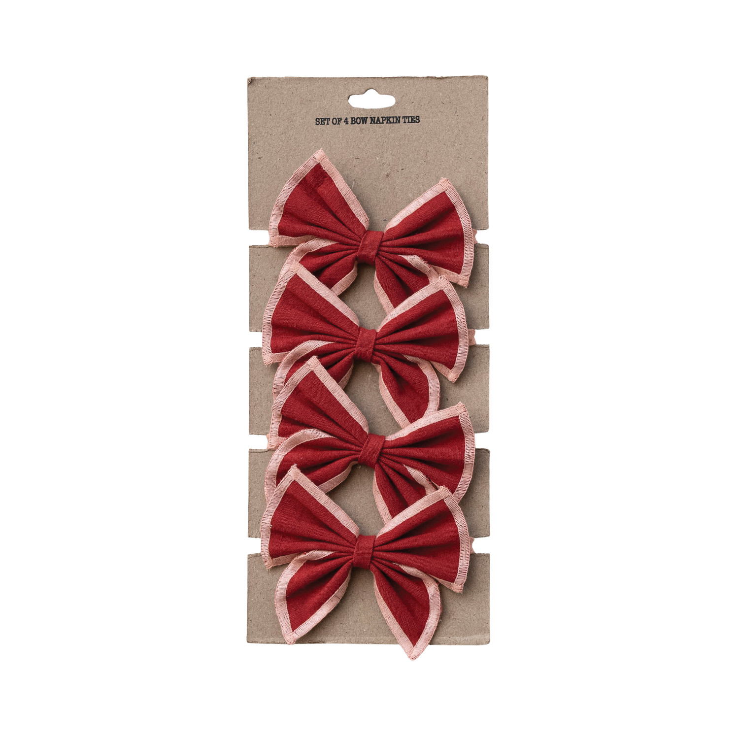 Cotton & Linen Bow Napkin Ties with Pink Stitched Edges, Red, Set of 4 on Card