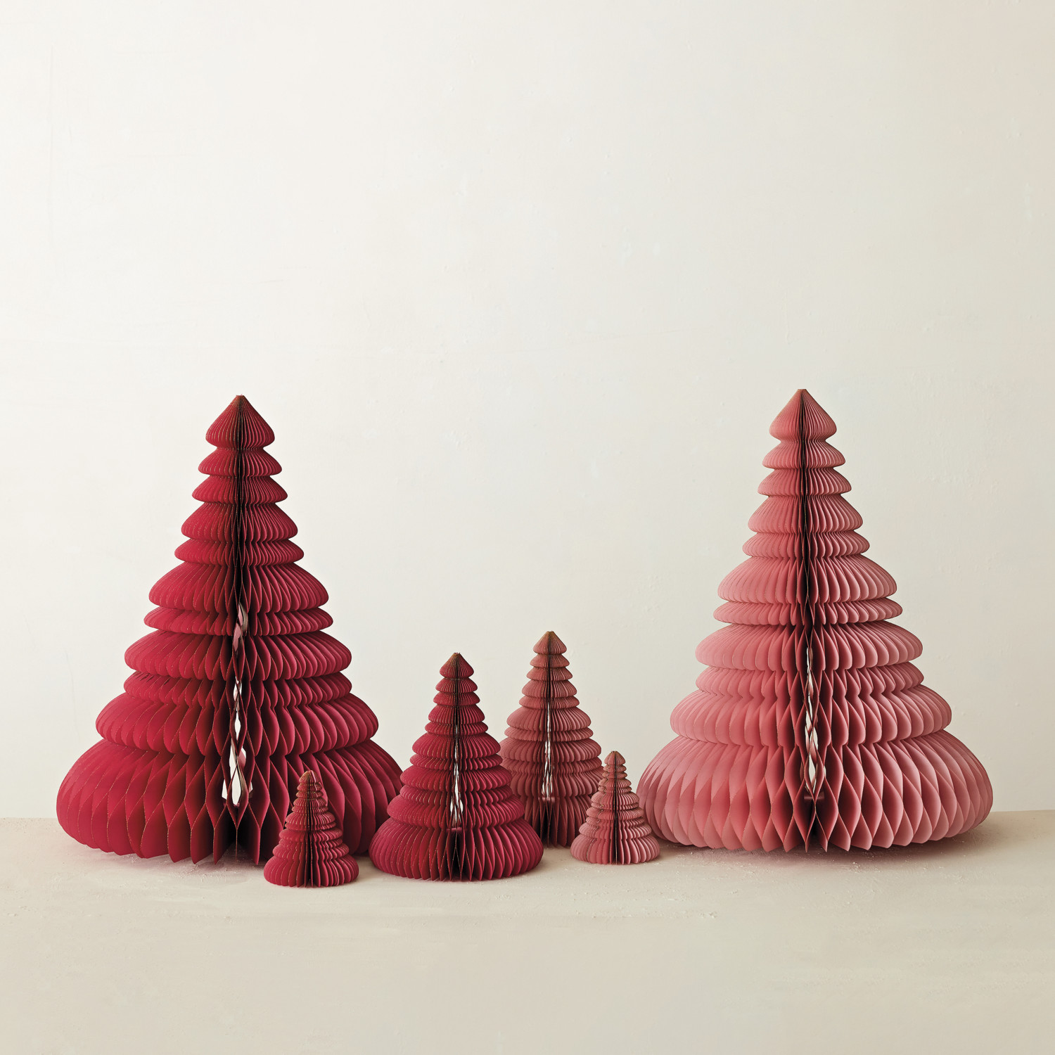 Catalog Name: 20" Round x 26"H, 9-1/2" Round x 12"H & 5" Round x 6"H Handmade Recycled Paper Folding Honeycomb Trees w/ Gold Glitter Edges, Pink, Set of 3