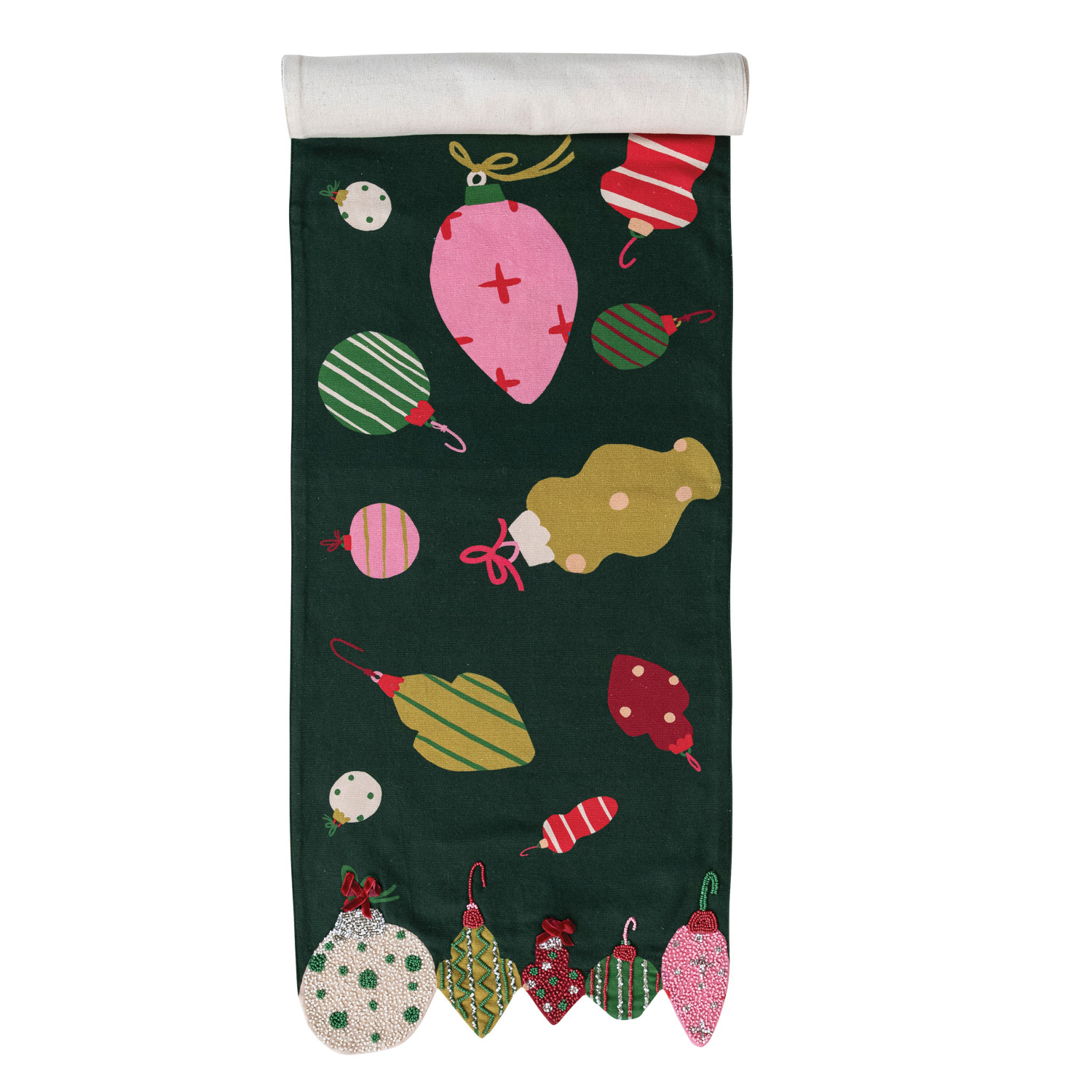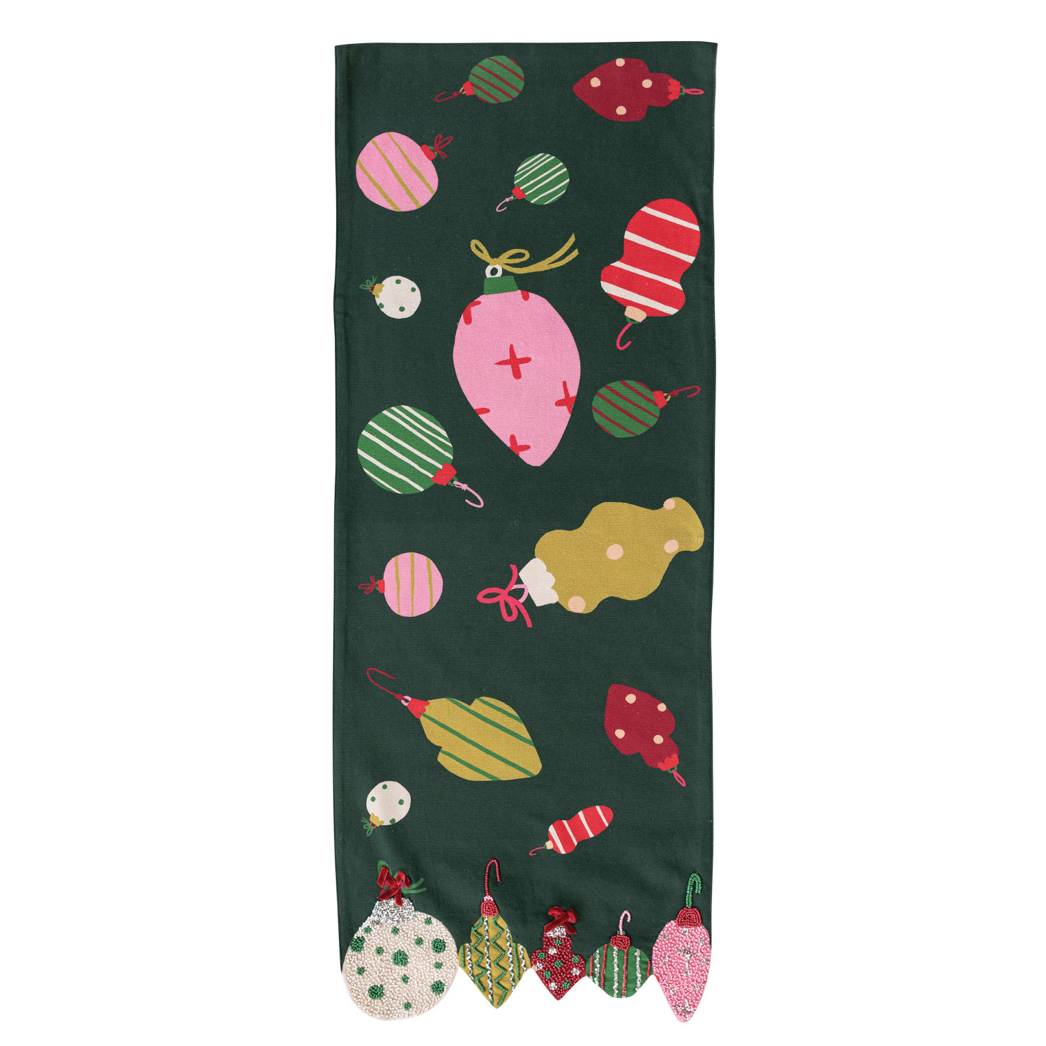 Catalog Name: 72"L x 14"W Cotton Printed Table Runner w/ Ornaments, Embroidery, Beads & Ornament Shaped Edge, Multi Color ©
