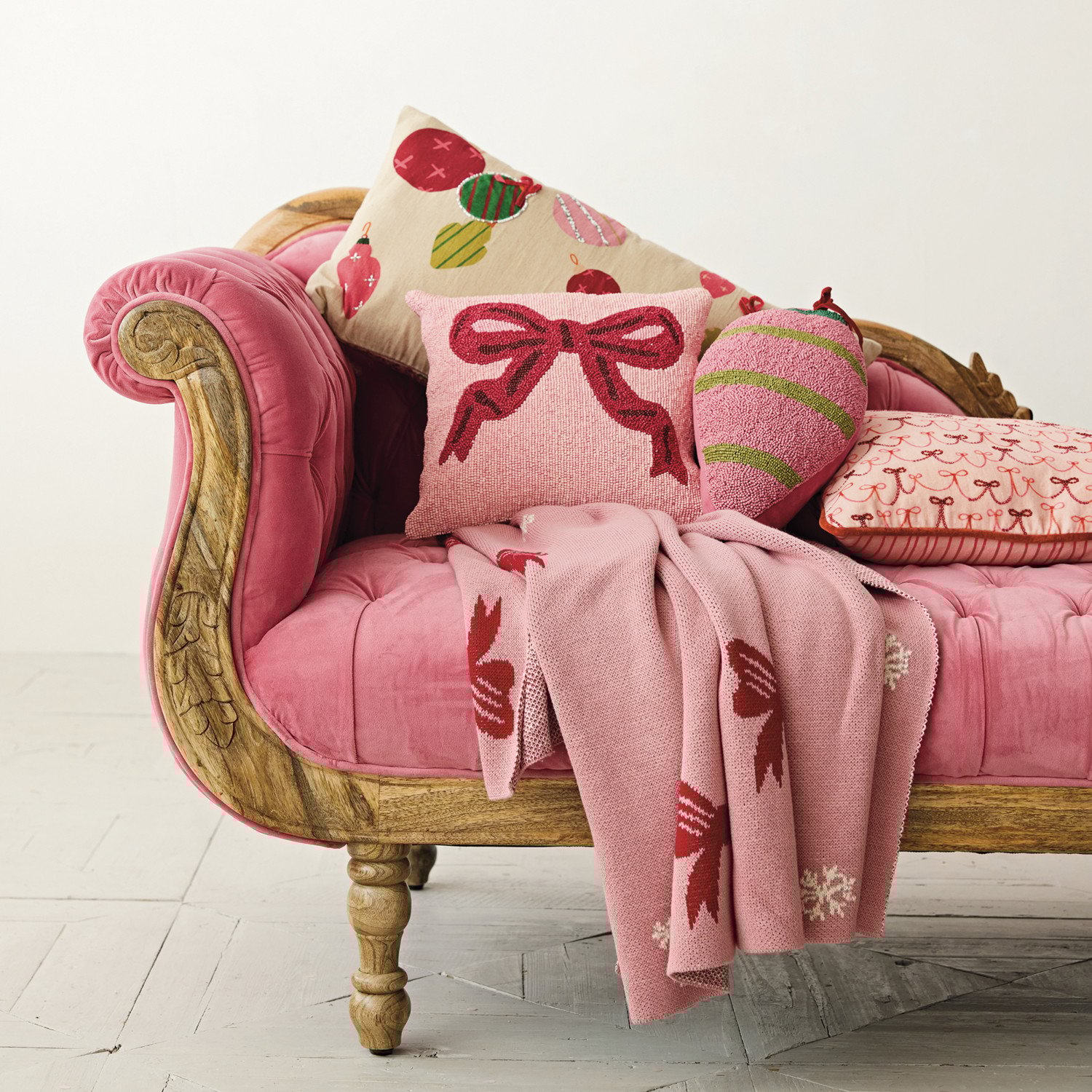 Catalog Name: 14" Square Glass Beaded Fabric Pillow w/ Bow, Pink & Red