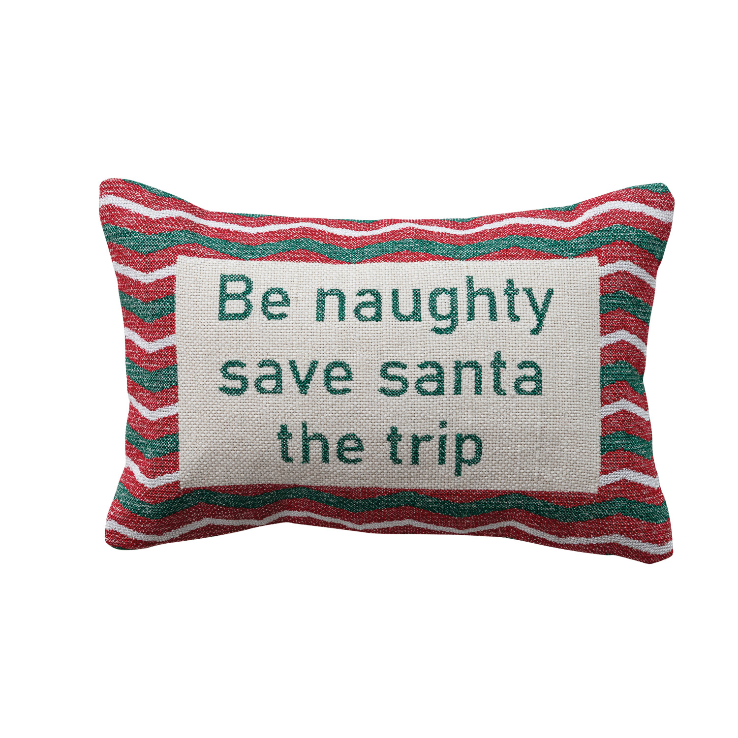 Catalog Name: 14"L x 9"H Cotton Embroidered Lumbar Pillow w/ Zig Zag Pattern "Be Naughty Save Santa...", Red, Green & Natural