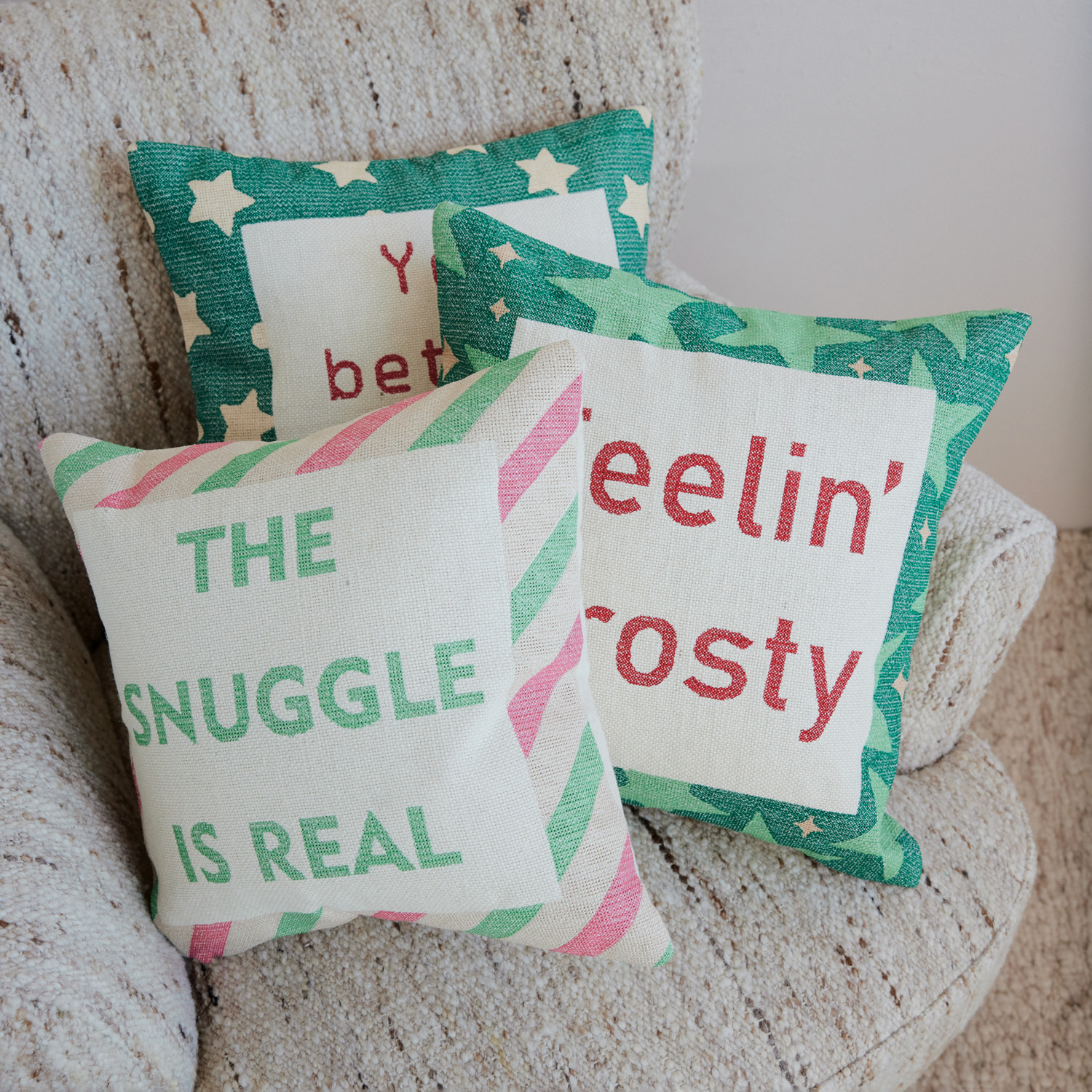 Catalog Name: 16" Square Cotton Embroidered Pillow w/ Star Pattern "You Better Not Pout", Multi Color