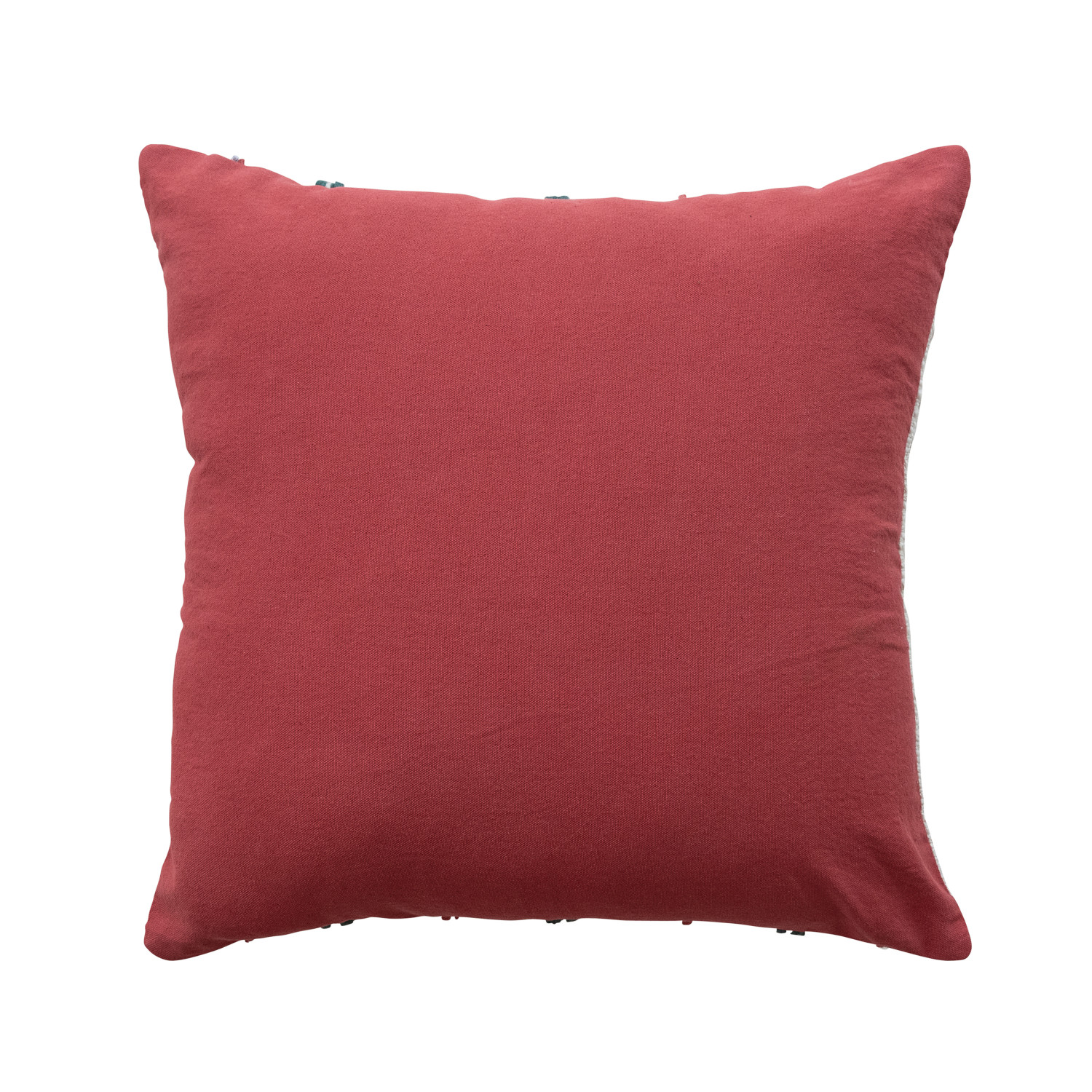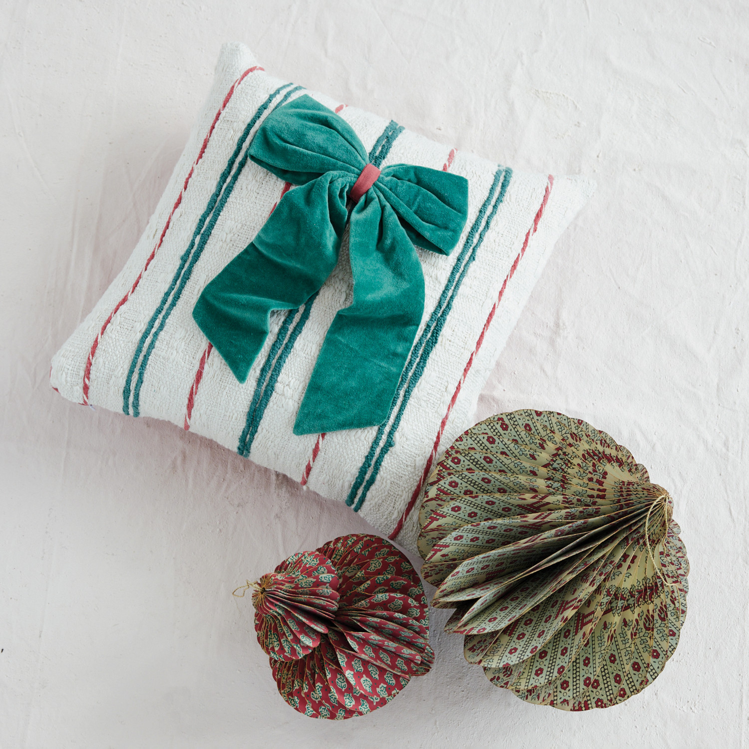 Catalog Name: 18" Square Cotton Slub Pillow w/ Embroidered Stripes & Velvet Bow, Natural, Green & Red
