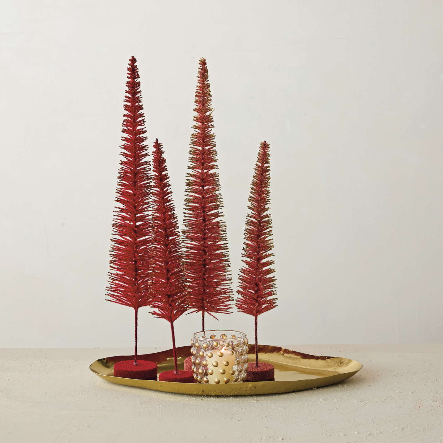Flocked Plastic Bottle Brush Tree with Glitter, Red & Gold Finish