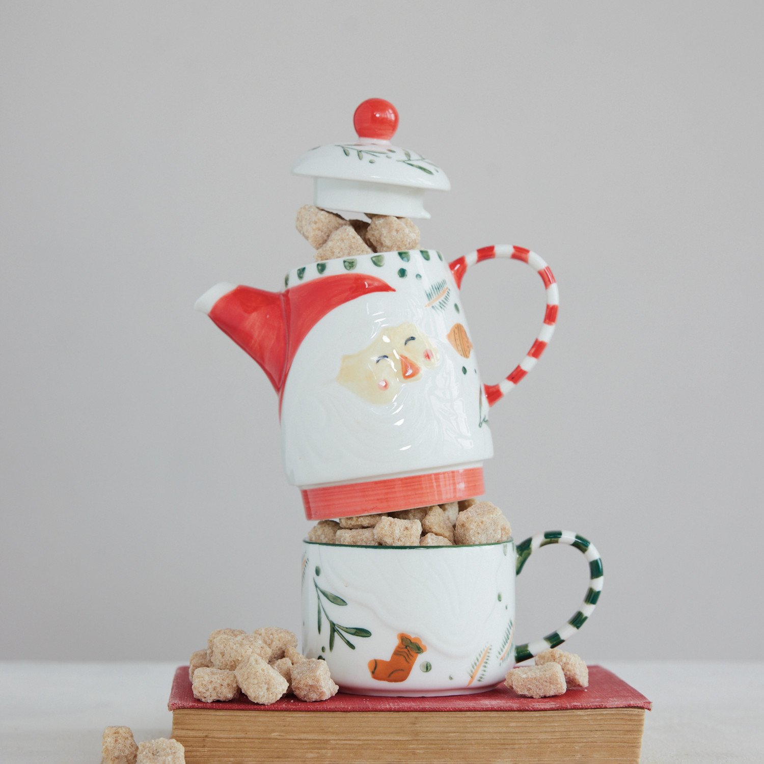 12 oz. Stoneware Tea For One with Santa & Striped Handles, Set of 2