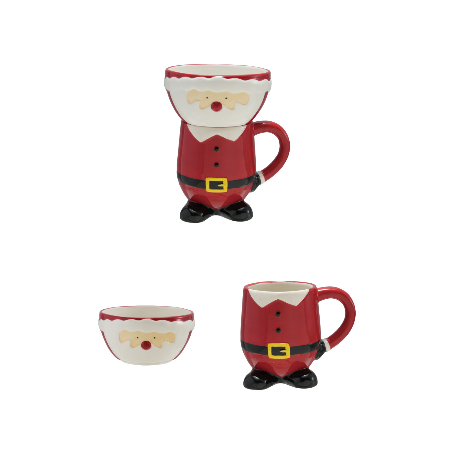 Catalog Name: 4-1/4" Round x 4-3/4"H 18 oz. Hand-Painted Ceramic Santa Shaped Mug & 5" Round x 2-1/2"H Stackable Bowl, Multi Color, Set of 2