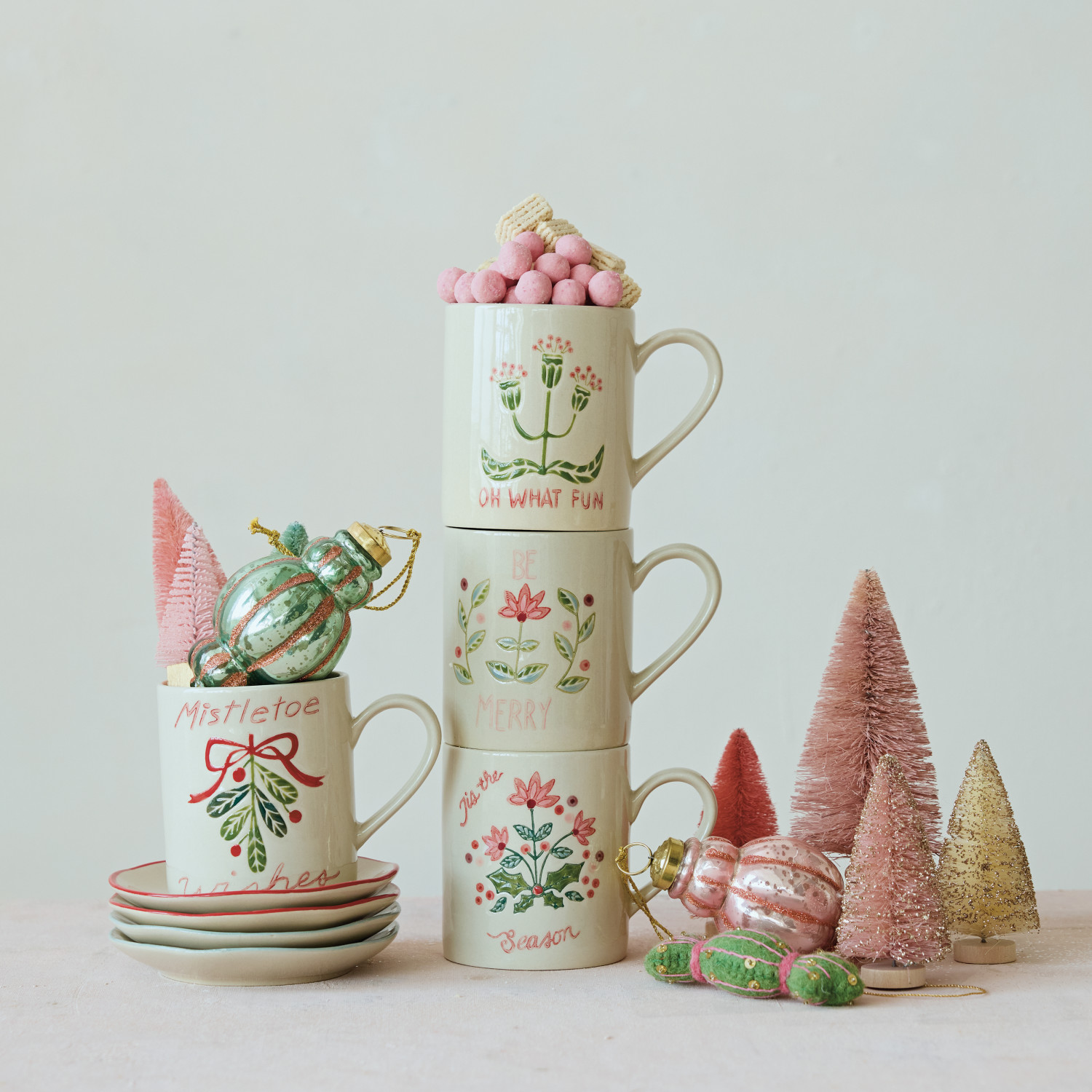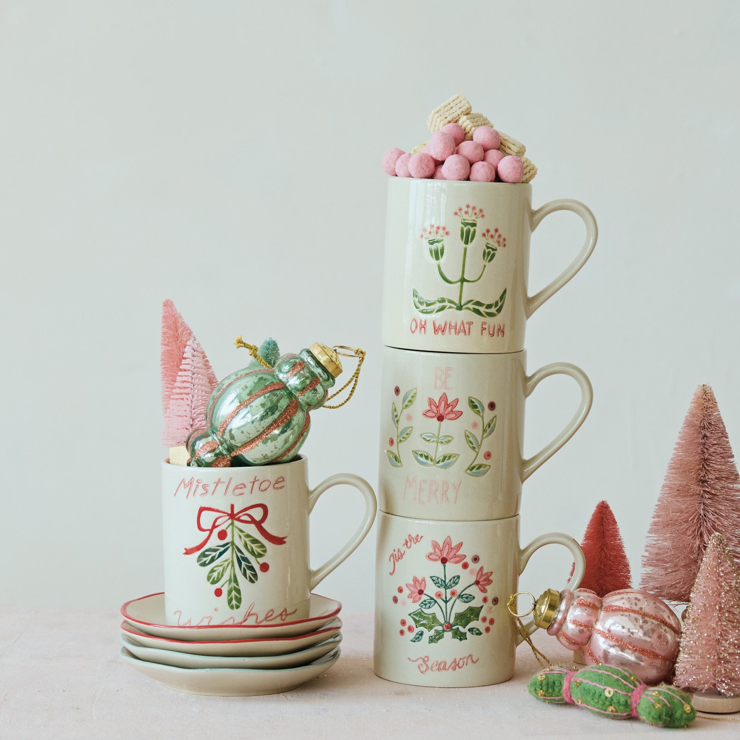 14 oz. Hand-Painted Stoneware Mug with Wax Relief Holiday Botanicals & Saying, 4 Styles ©