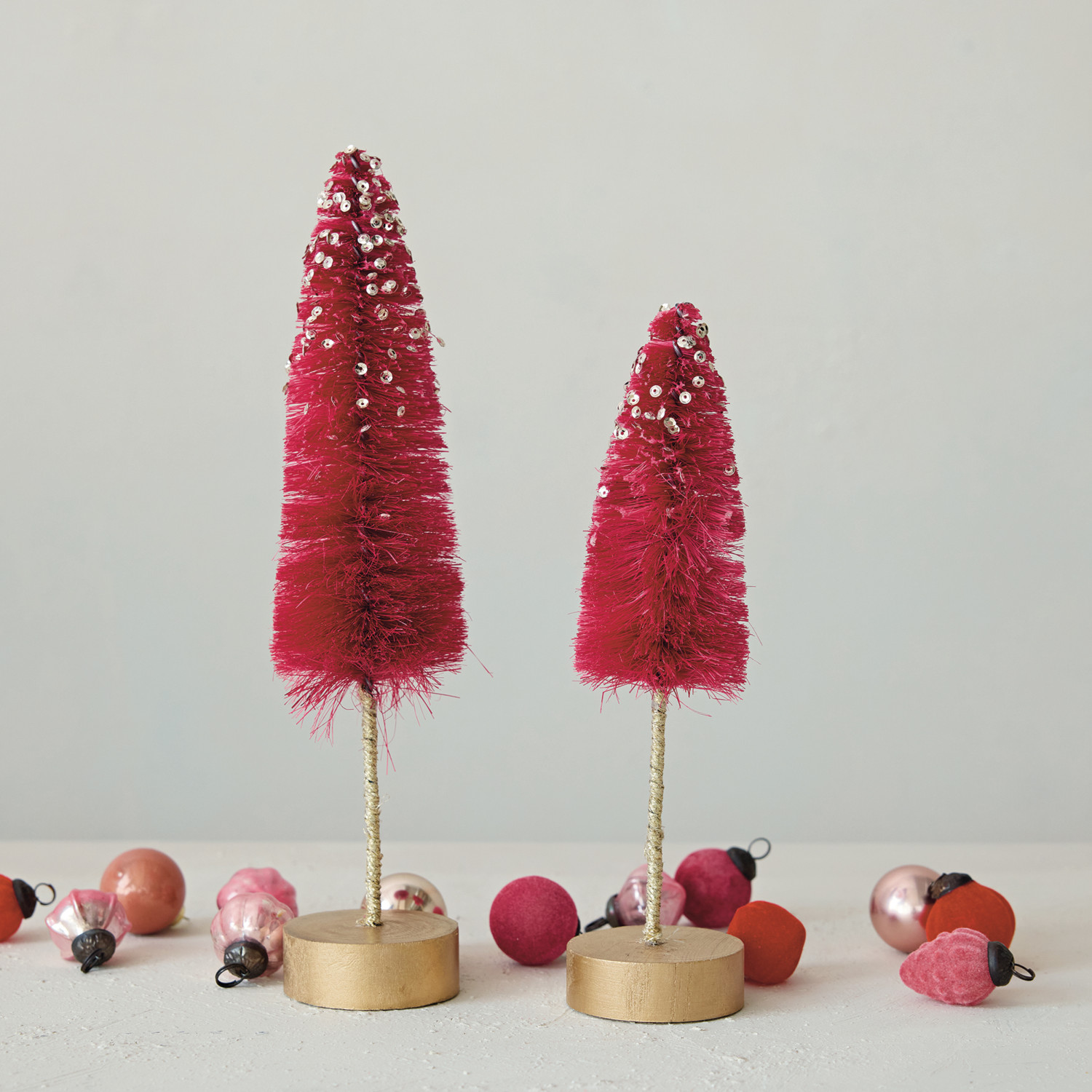 Catalog Name: 2-3/4" Round x 12-1/4"H Sisal Bottle Brush Tree w/ Sequins & Wood Base, Fuchsia Color