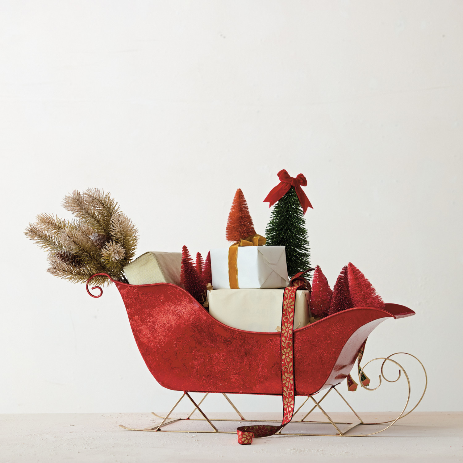 Catalog Name: 21-3/4"L x 7-1/2"W x 10-1/4"H Decorative Metal Sleigh Container, Distressed Red & Gold Finish