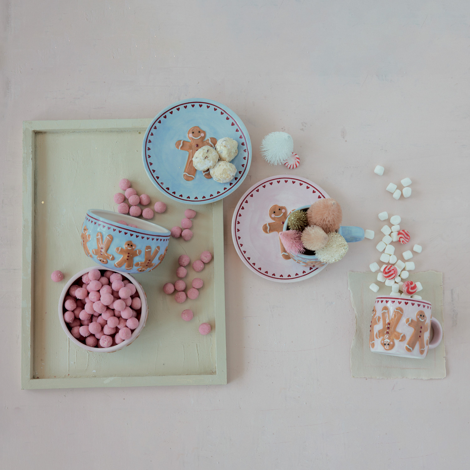 10 oz. Hand-Painted Stoneware Mug with Wax Relief Gingerbread Pattern & Hearts, 2 Colors