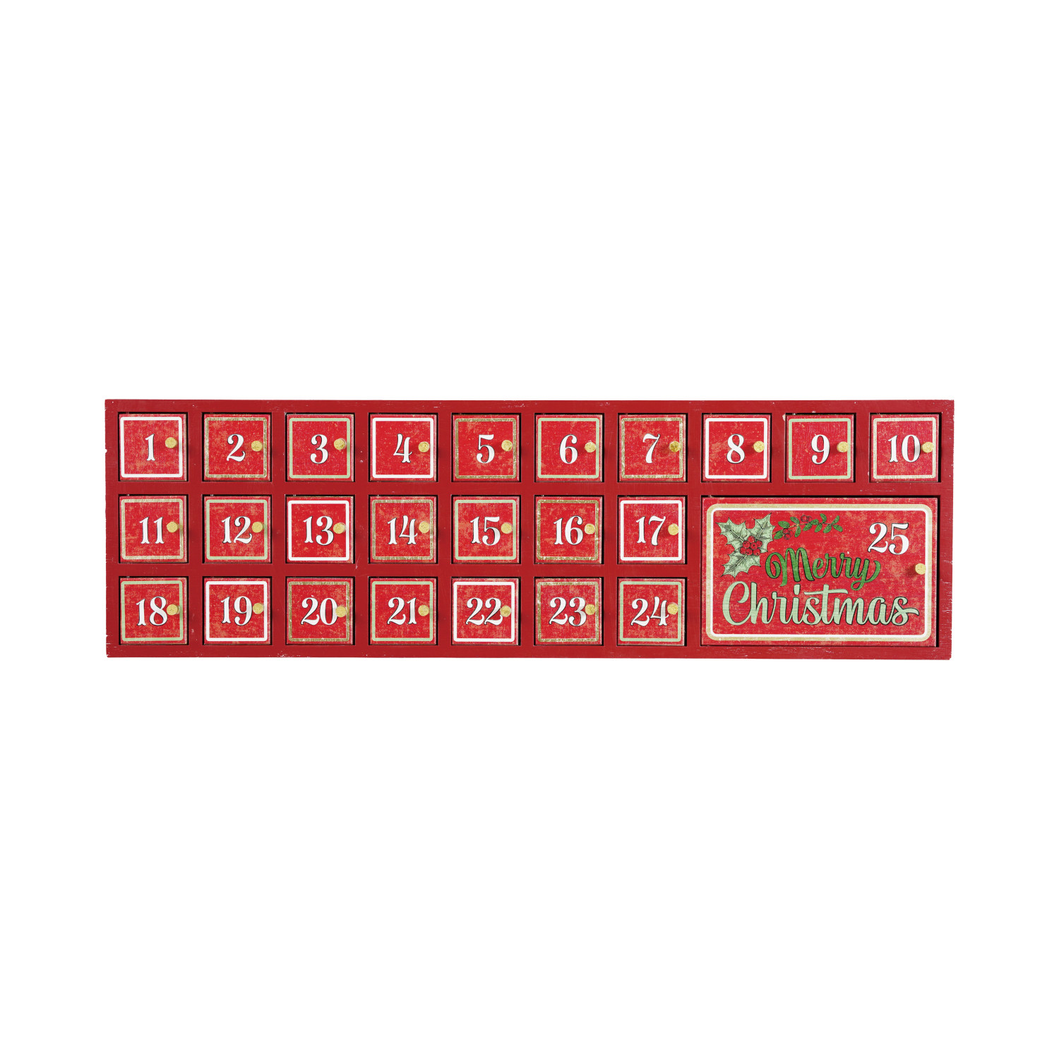 Catalog Name: 31-1/2"L x 4-3/4"W x 9-1/2"H MDF Advent Calendar w/ 25 Doors "Merry Christmas", Red, Green & White (Hangs or Sits)