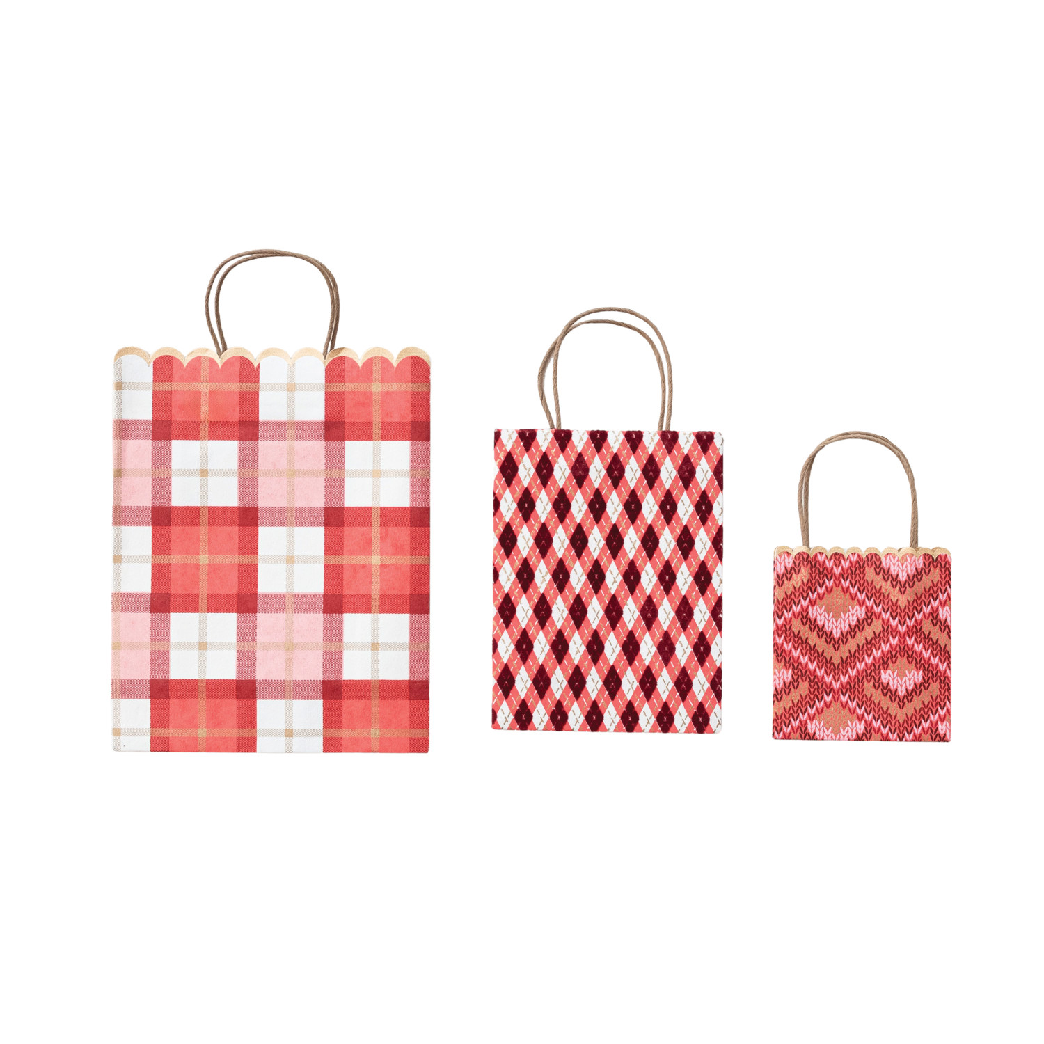Catalog Name: 9"L x 4"W x 11-1/2"H, 6-1/2"L x 3-1/2"W x 8-1/2"H & 5"L x 3"W x 5-1/2"H Handmade Printed Scalloped Recycled Paper Gift Bags w/ Patterns, Multi Color, Set of 3