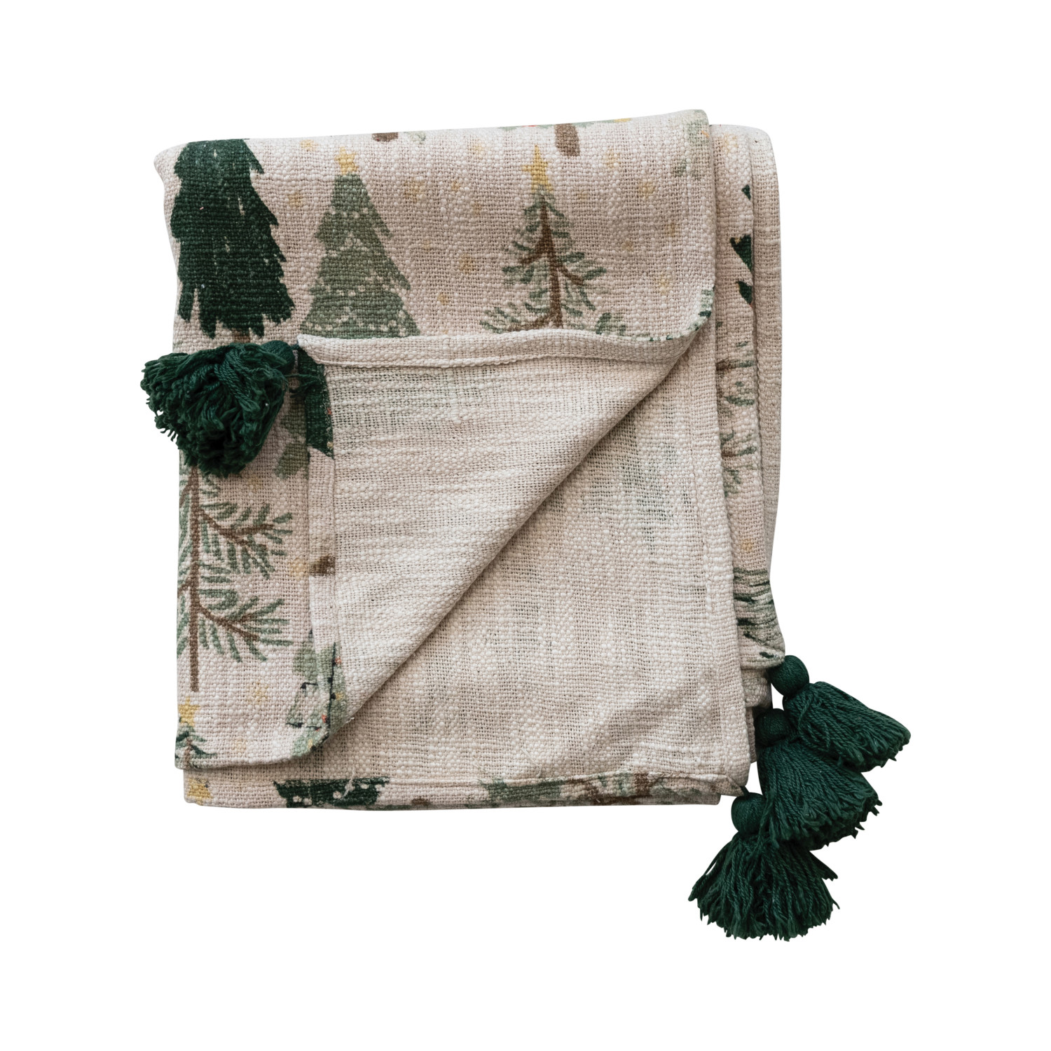 Catalog Name: 60"L x 50"W Cotton Printed Throw w/ Tree Pattern & Tassels, Multi Color