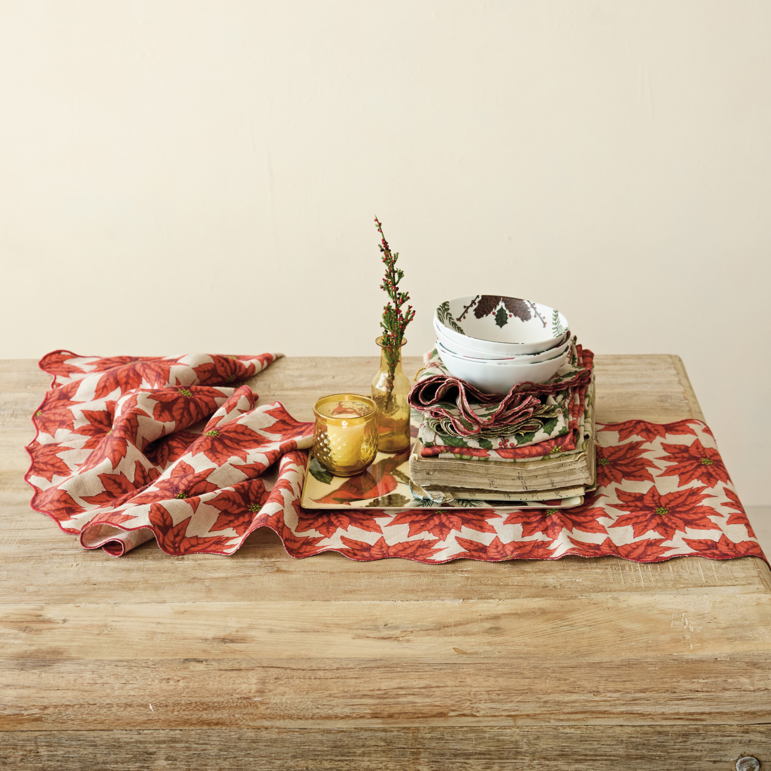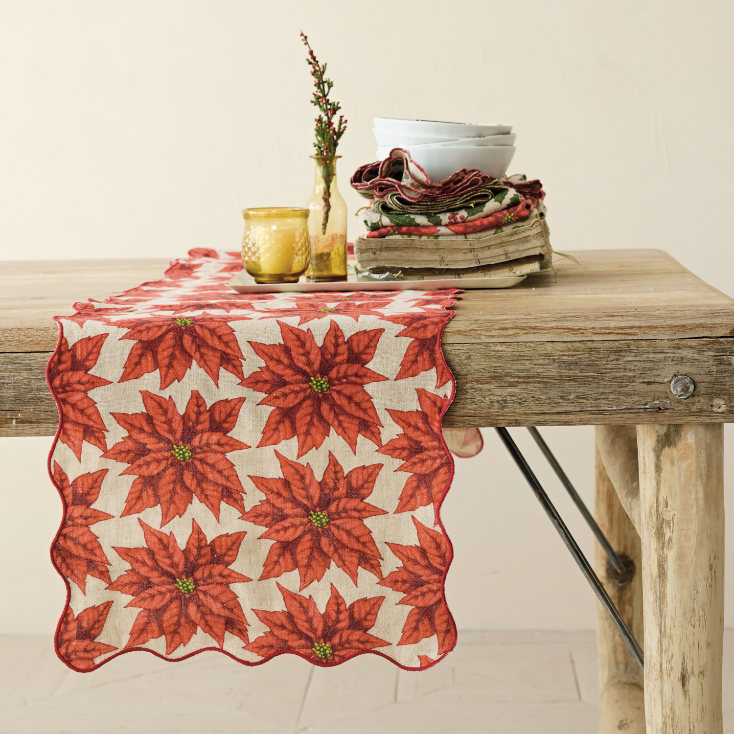 Linen Printed Scalloped Table Runner with Poinsettia Pattern & Stitched Edge & Red ©