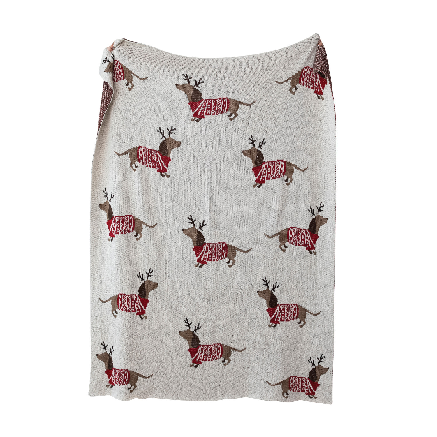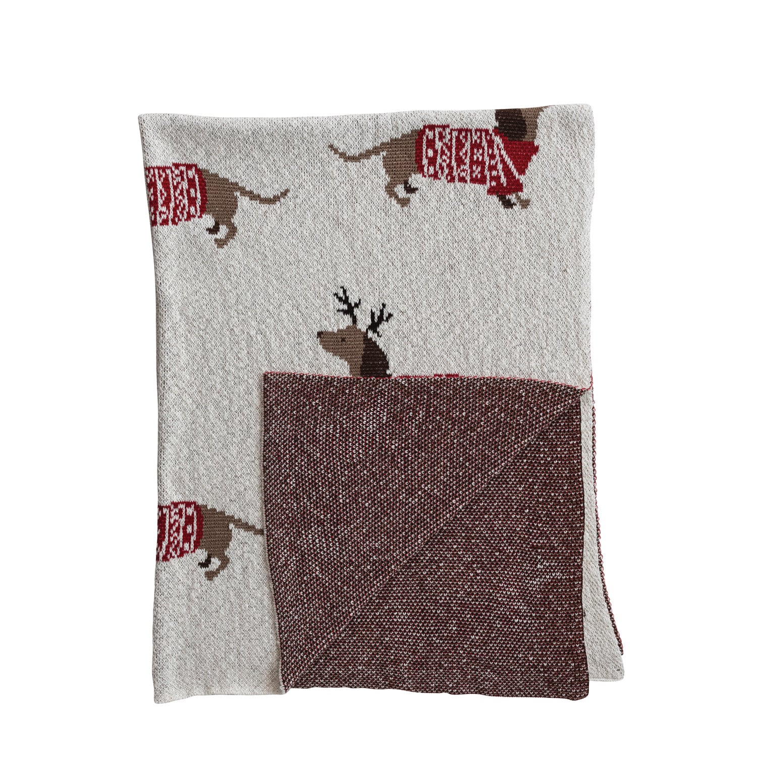 Cotton Knit Throw with Daschunds in Antlers & Sweaters, Natural, Red & Brown
