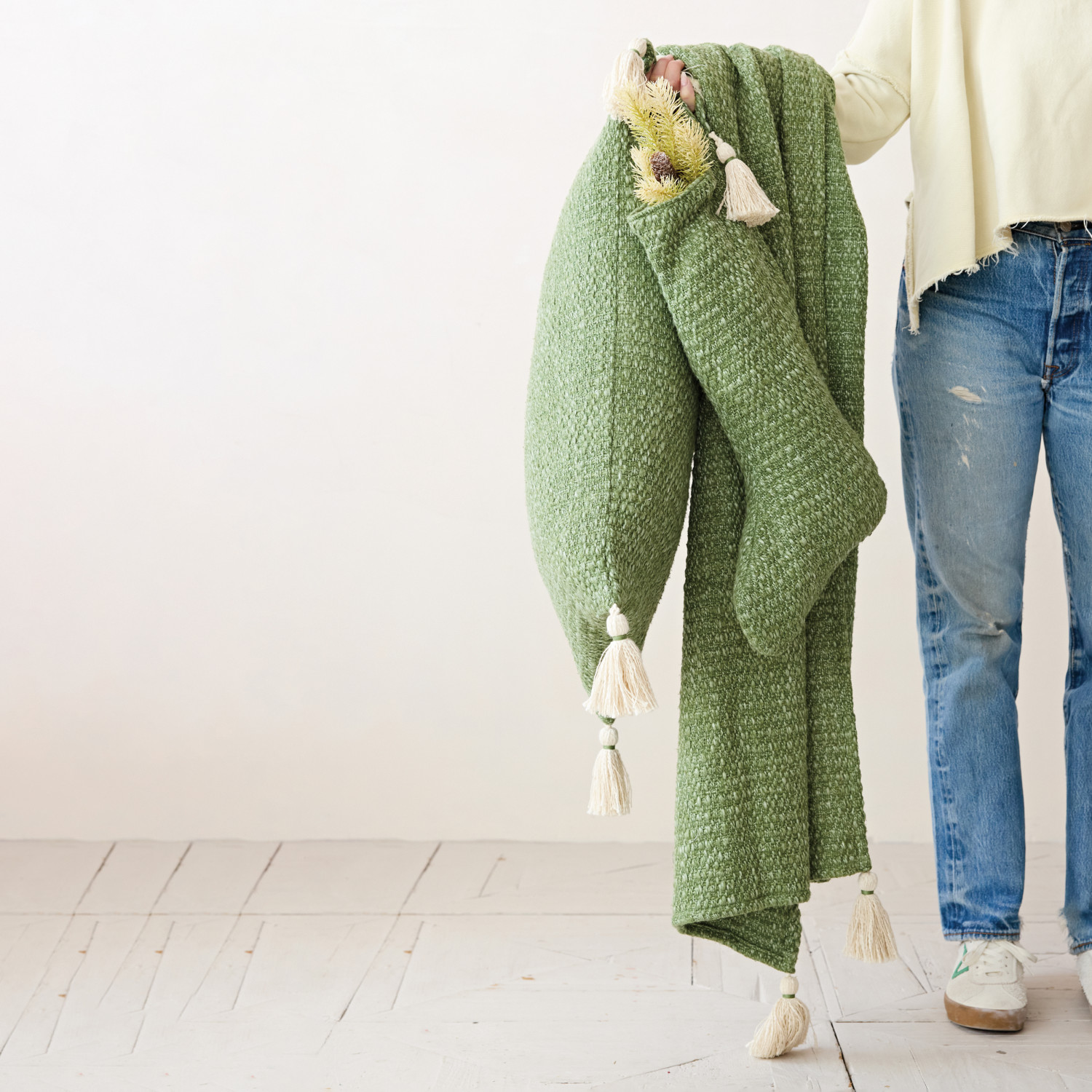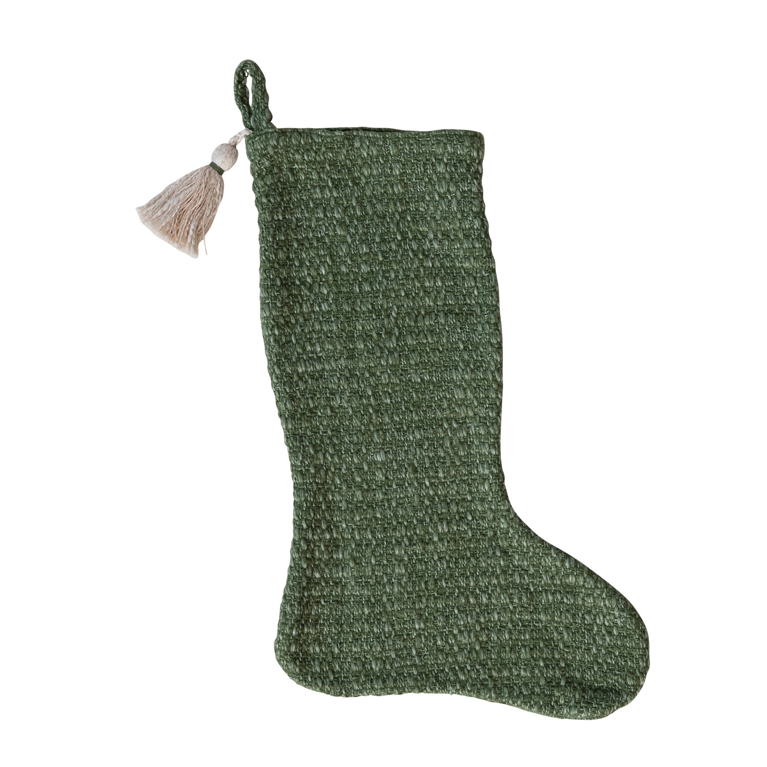 Catalog Name: 20"H Stonewashed Woven Cotton Blend Slub Stocking w/ Tassel, Green & Cream Color