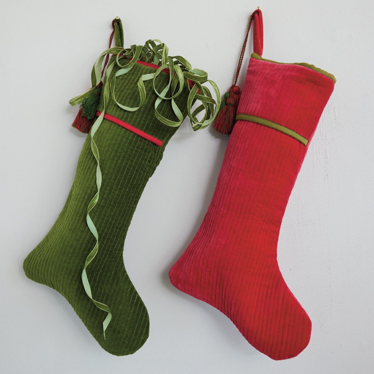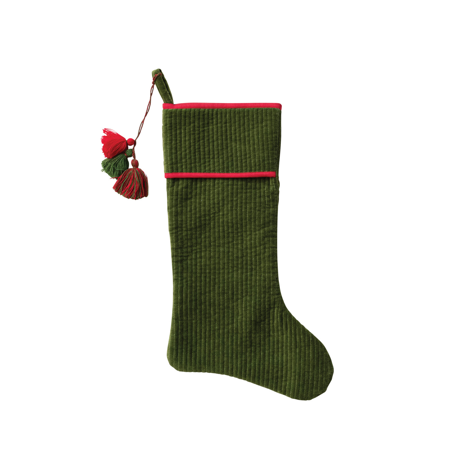 Cotton Velvet Quilted Stocking with Tassels, Green & Red