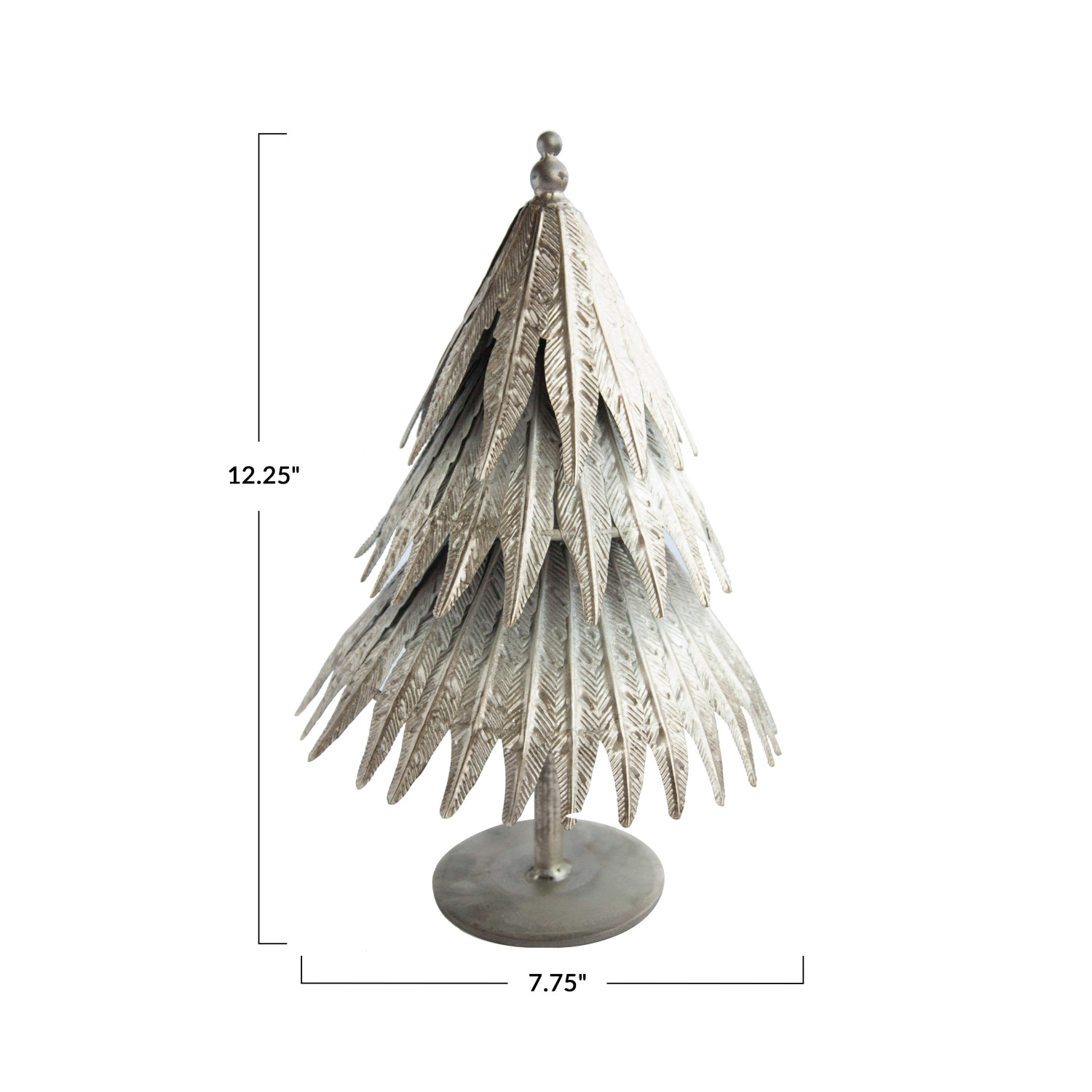 This distressed pewter embossed metal tree on stand is a lovely and unique way to decorate for the holidays. It features a round metal tree on a stand that has a distressed pewter finish and an embossed pattern, creating a cozy and rustic effect. It has a natural and elegant look that can suit any festive theme, from traditional to modern. This is ideal for displaying on a table, mantel, shelf, or window sill, where it can add a touch of warmth and charm to the space. It can also stand on its own or be paired with other trees or ornaments, making it a versatile and customizable option. It's made of metal that is durable, sturdy, and easy to clean, making it a convenient and reusable option. It measures 7.75 inches in diameter and 12.25 inches in height, making it a graceful and noticeable centerpiece. Elevate the holiday decor with this eye-catching Christmas tree, adding both style and a touch of whimsy. A round and rustic metal tree on stand that has a distressed pewter finish and an embossed pattern. A cozy and charming addition to any holiday decor, this metal tree on stand brings a touch of vintage and industrial style to any room. Ideal for displaying on a table, mantel, shelf, or window sill, this metal tree on stand can stand on its own or be paired with other trees or ornaments.