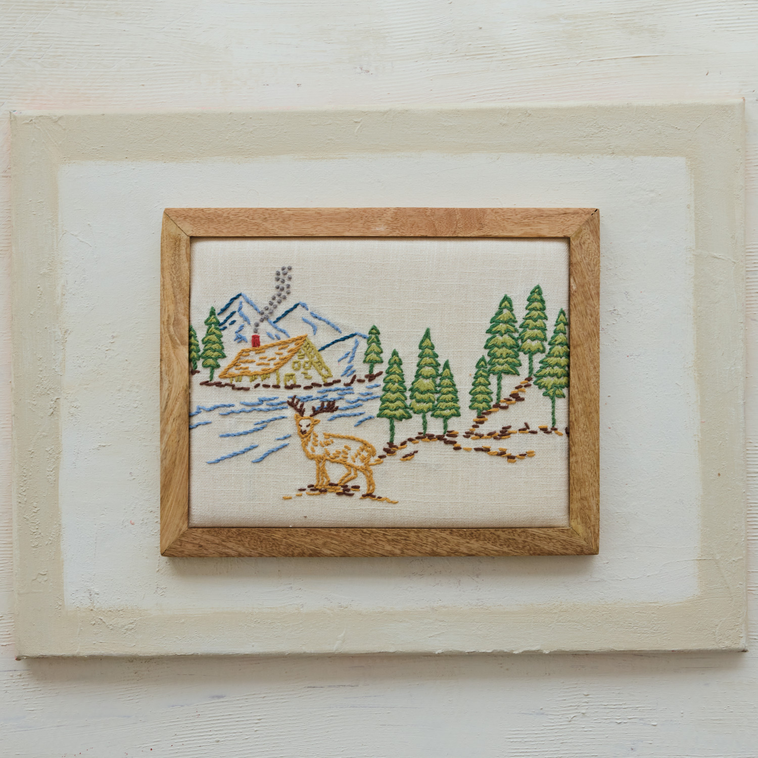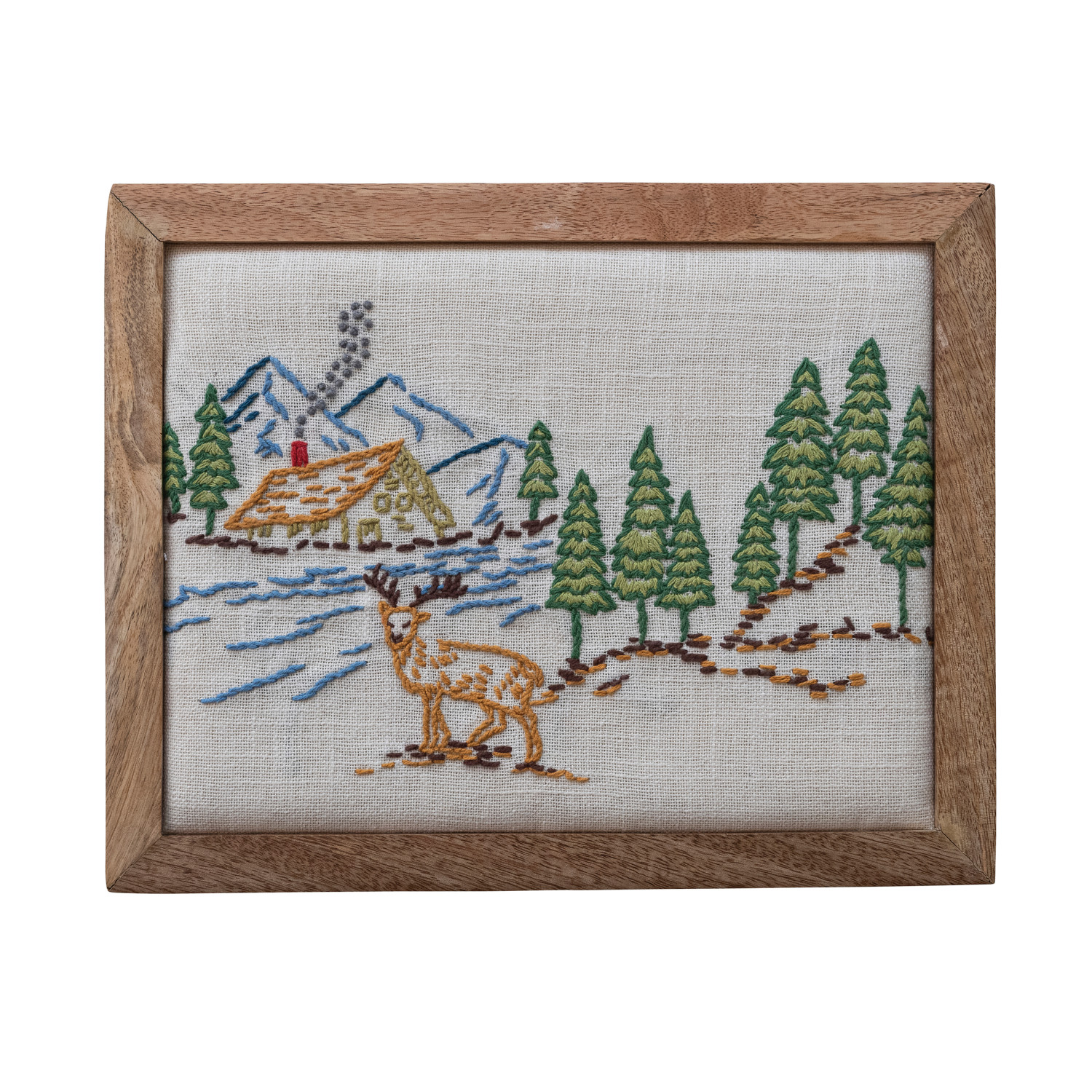 Catalog Name: 14"L x 11"H Mango Wood Framed Cotton Embroidered Wall Décor w/ House, Mountains, Trees & Deer, Multi Color