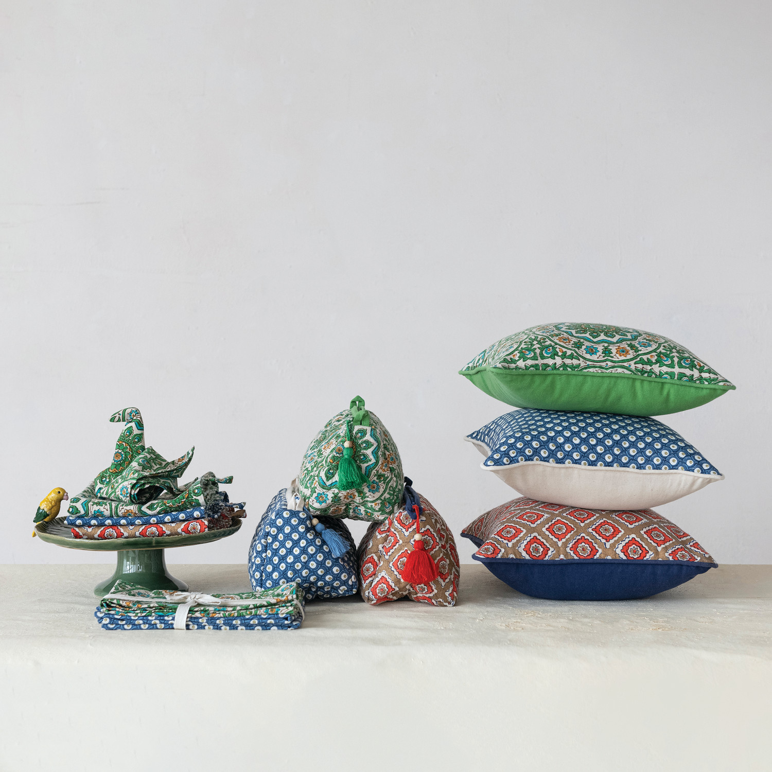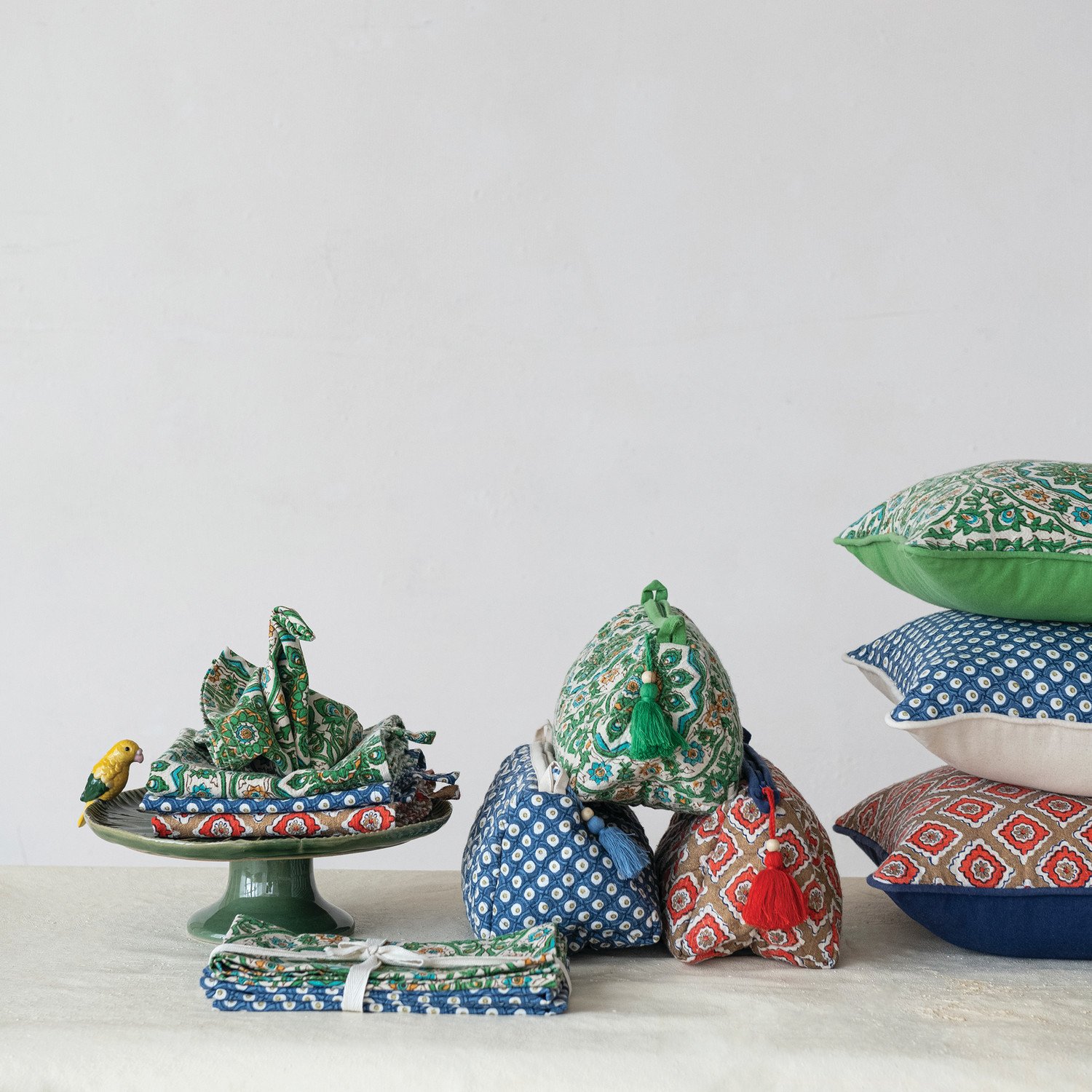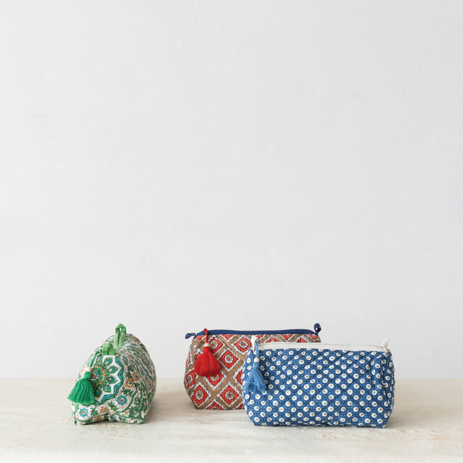 Catalog Name: 9"L x 4-1/2"W x 4-1/2"H Quilted Cotton Slub Printed Zip Pouch w/ Block Print Pattern, Interior Lining, Wood Bead & Tassel, Multi Color, 3 Styles