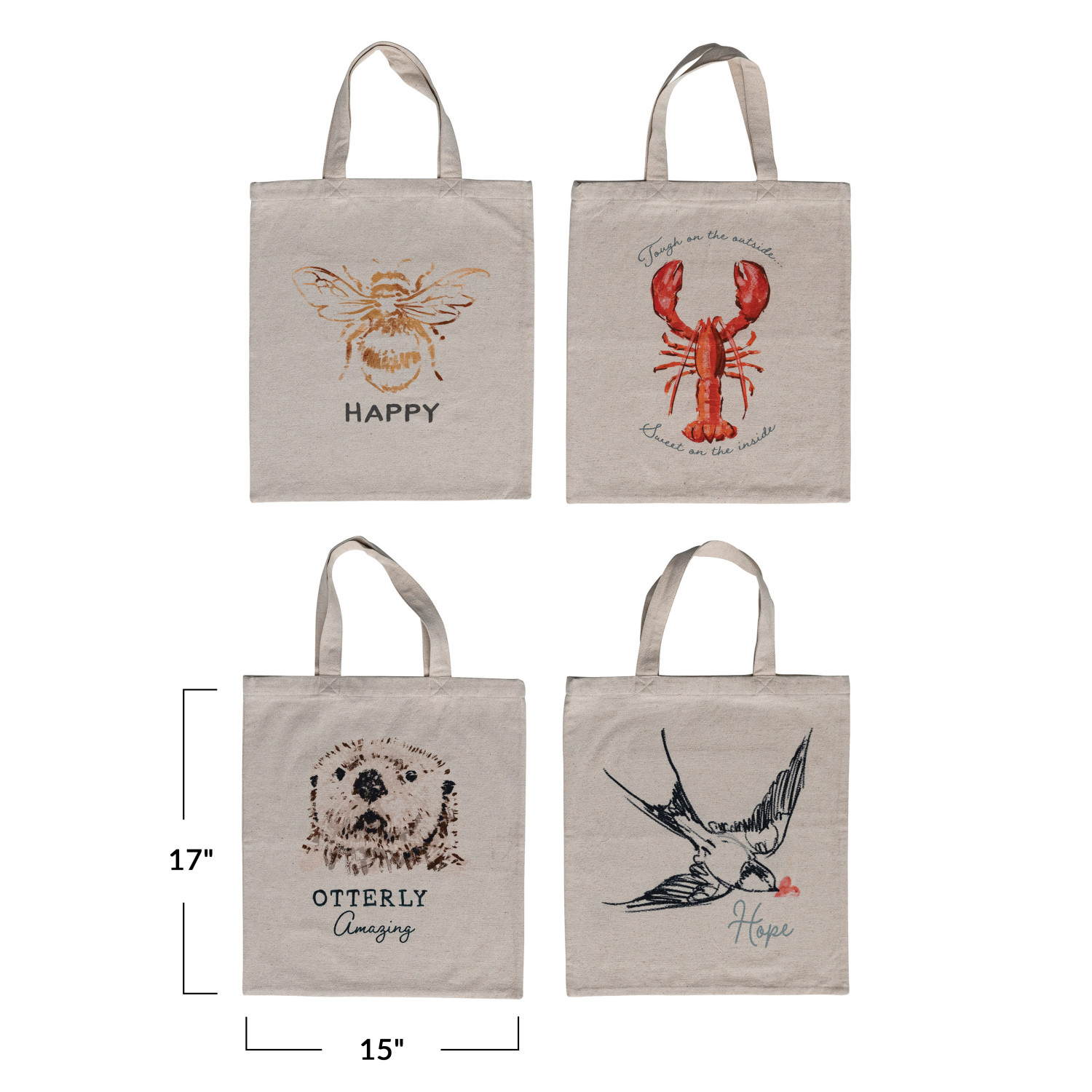 Catalog Name: 15"L x 17"H Cotton & Linen Printed Tote Bag w/ Animal/Saying, Handles, Interior Pocket & Lining, Multi Color, 4 Styles ©