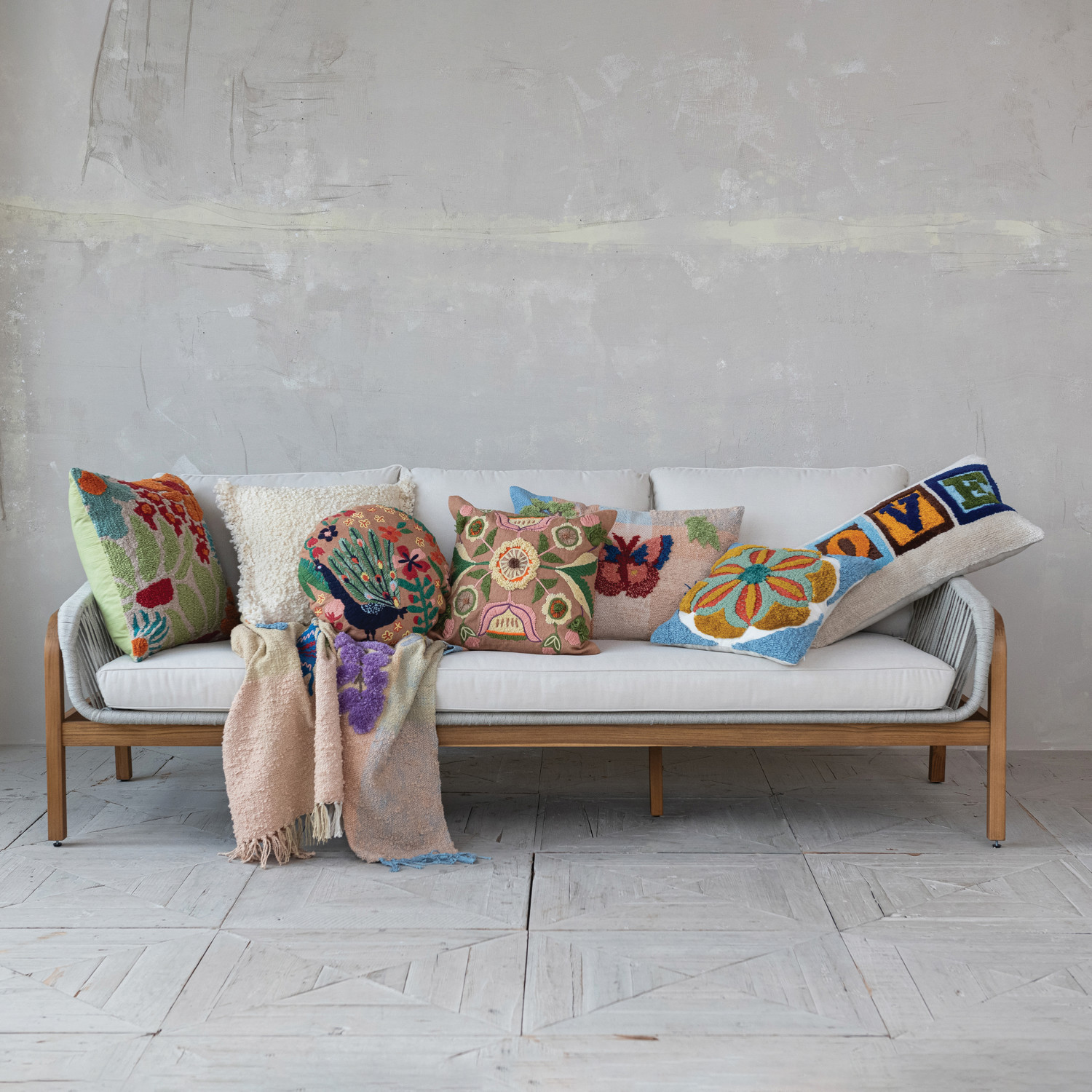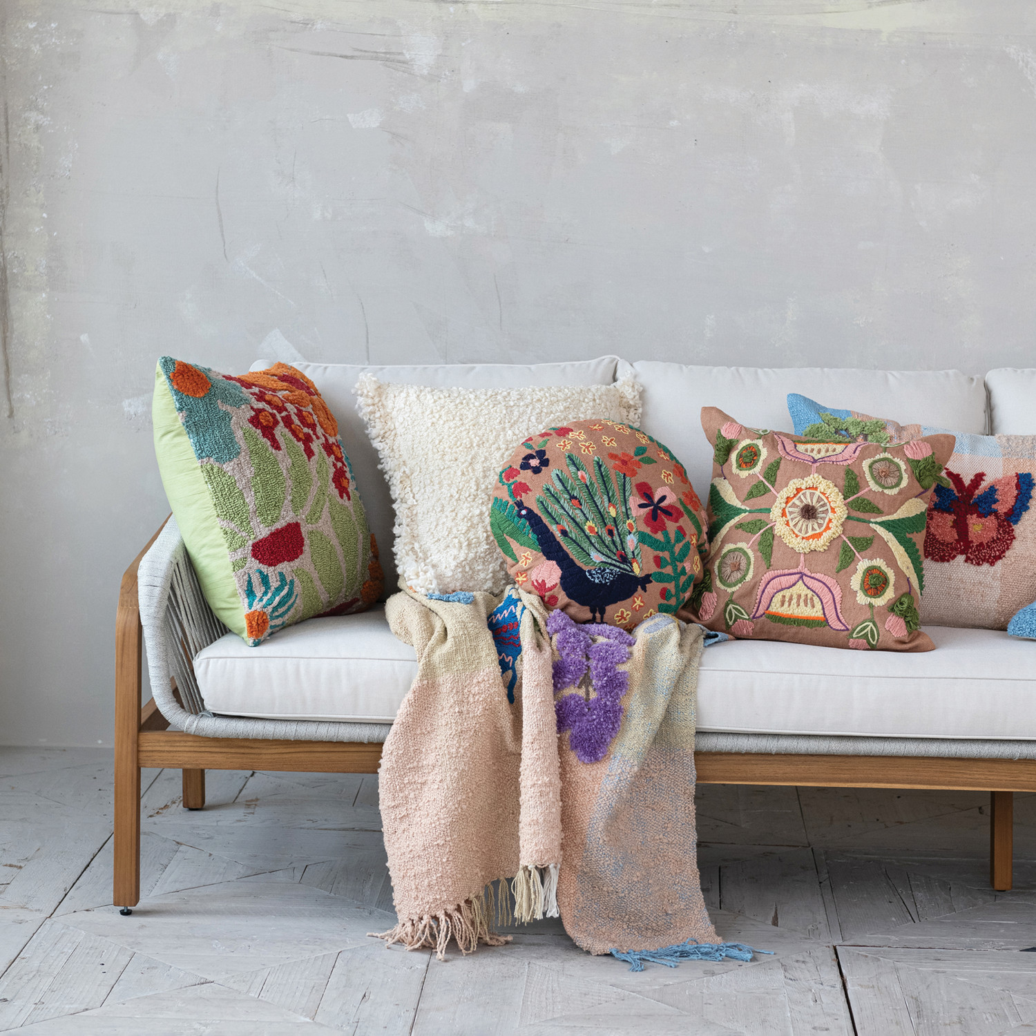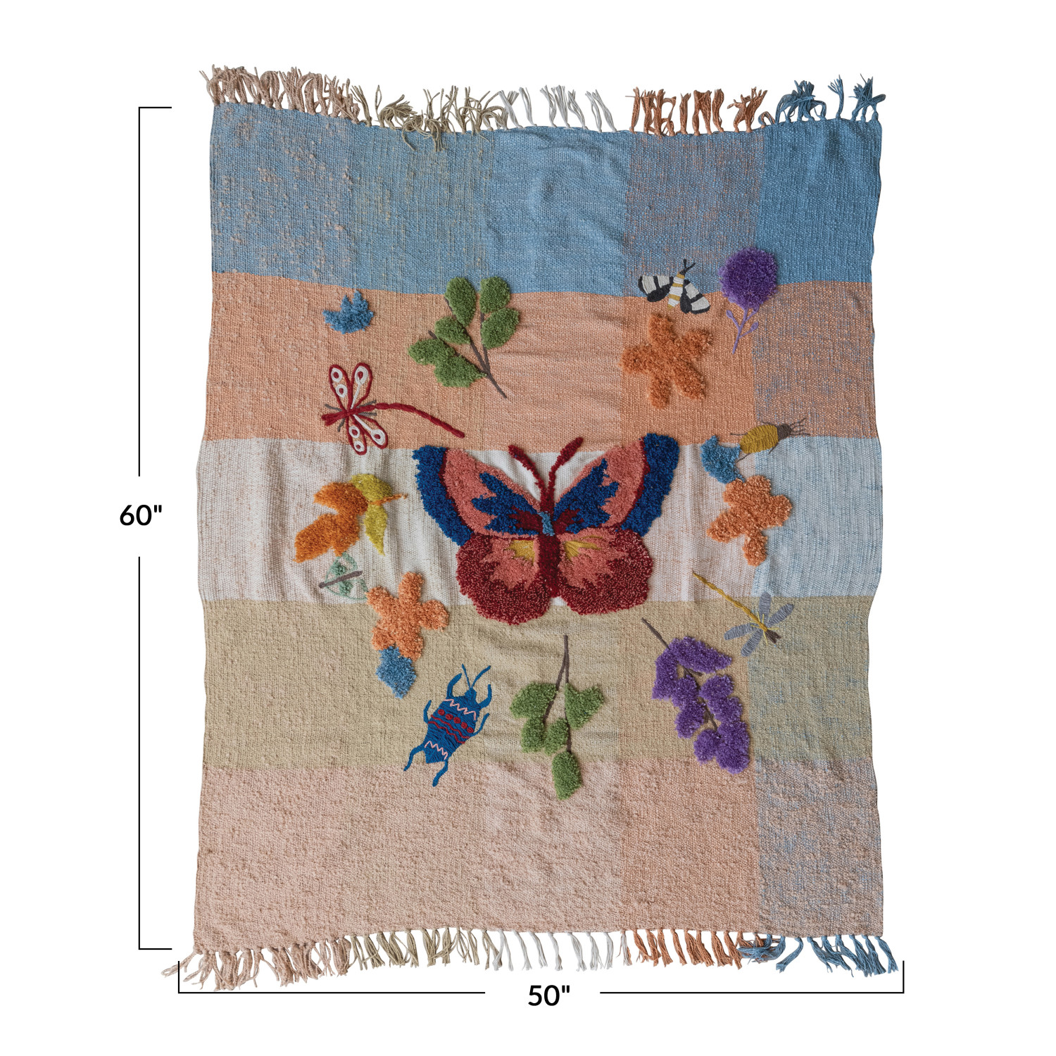 Catalog Name: 60"L x 50"W Woven Fabric Throw w/ Tufting, Embroidery, Flowers, Insects & Fringe, Multi Color Plaid